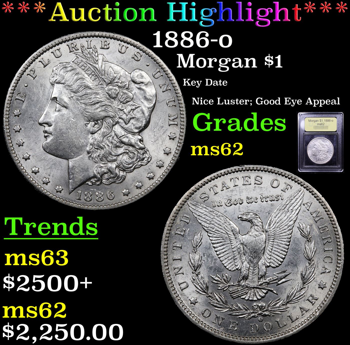 ***Auction Highlight*** 1886-o Morgan Dollar $1 Graded Select Unc By USCG. Melting under the Pittman Act, and perhaps other unknown factors, make the 1886-O conditionally rare. By New Orleans standards, the mintage was large -- more than 10.7 million pieces were struck, yet no appreciable Mint sewn bags have materialized during the past 60 to 70 years. In Gem or finer conditions, no other Morgan dollar issue is rarer, based on the combined certified populations at PCGS and NGC. This untoned, frosty white Mint State example of this well known condition rarity is sure to please. A Corey's Pick, Bid to Win, Don't let it get Away Coin