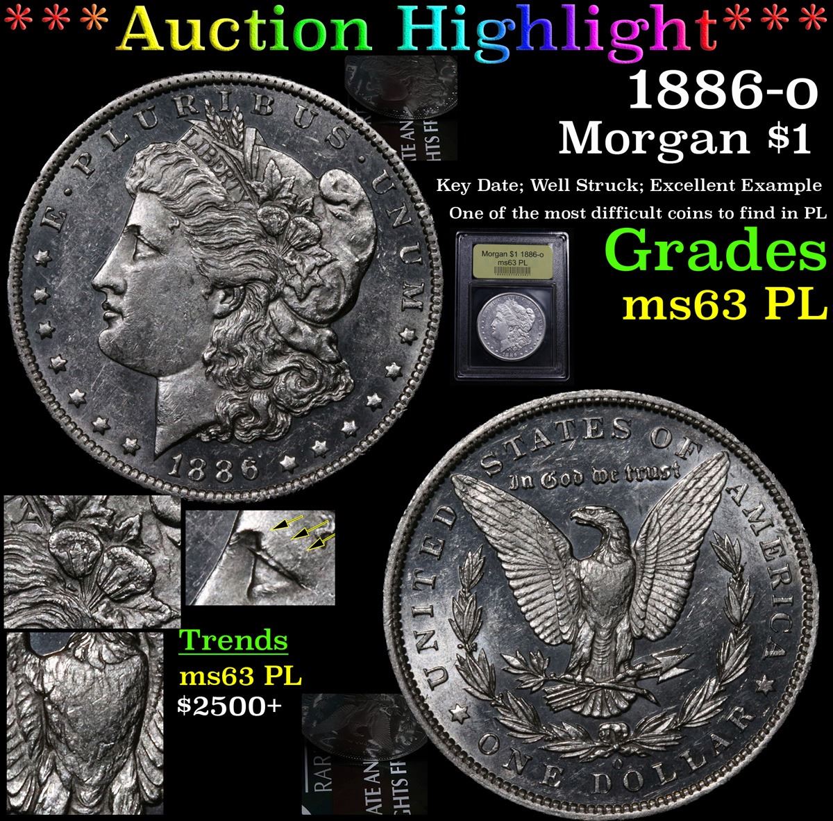 ***Auction Highlight*** 1886-o Morgan Dollar $1 Graded Select Unc PL By USCG. Up for auction is a conditional rarity, a Proof Like 1886-o Morgan. The 1886-O is one of the most difficult Morgan dollars to locate with proof like fields. PCGS reports a total of 10 Proof like pieces in all grades, along with 8 Deep Proof like coins. The scarcity of reflective examples is amplified by the elusiveness of this issue overall compared to other dates in the series. The 1886-O is nearly uncollectible at the Gem grade level. This Choice example is tied for 2nd finest Proof like coin. The fields are genuinely mirrored and untoned, while the softly frosted devices stand in contrast on each side. A few light marks are consistent with the grade on this well-struck and appealing example. A Corey's Pick, Bid to Win, Don't let it get Away, you might not find its equal Coin. I give this coin my highest recommendation
