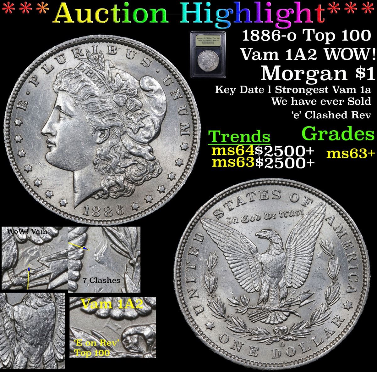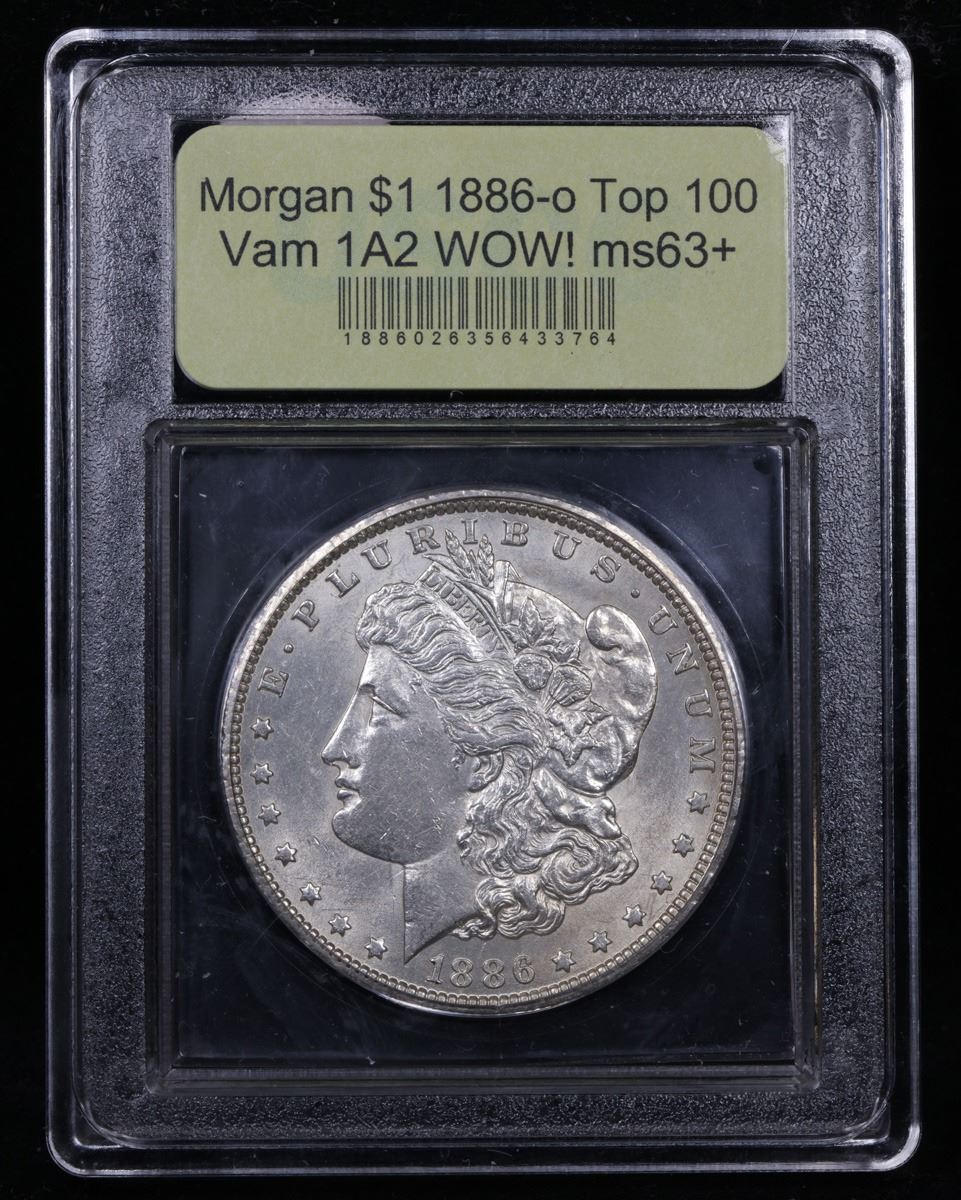 ***Auction Highlight*** 1886-o Top 100 Vam 1A2 WOW! Morgan Dollar $1 Graded Select+ Unc By USCG. Up for Auction is the strongest Vam 1a we have ever had the privilege to bring to auction. The Vam 1A is the Legendary �E on Reverse� Top 100 and WOW! Morgan Vam of the Rare Key Date 1886-o. Besides being the 1A, this is the Ultra Scarce 1A2, or �7 Clashes� Sub Variety. Of this variety, I have never seen an example with the wild clashing above the Arrows. An incredible, Ultra Late Die State. Super Strong �E� below the tailfeathers. Besides the Variety, the 1886-o in this condition is an ultra Rarity. Superb Luster, extraordinary Strike with great breast Feathers. But with strong clashing like this one would expect a Great Strike. Perfect, unbroken luster, a true Uncirculated beauty. A Corey's Pick, Bid to Win, Don't let it get Away, you might not find its equal Coin. I give this coin my highest recommendation