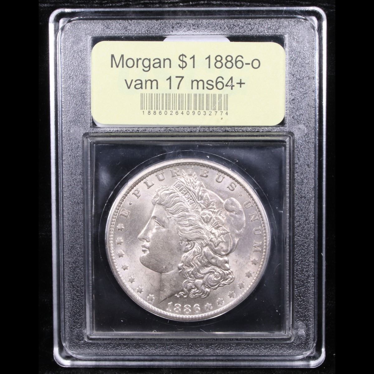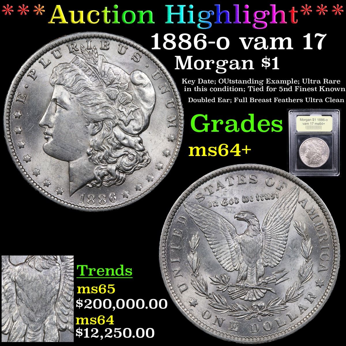 ***Auction Highlight*** 1886-o vam 17 Morgan Dollar $1 Graded Choice+ Unc By USCG. The 1886-O dollar stands out as being the rarest New Orleans issue in MS65 or better condition as only four Gem specimens are known to exist. The current offering belongs to a small fraternity of high-end very near Gem 1886-O dollars. After more than 25 years of third-party grading, only three coins are currently documented at the MS65 level. Two MS65 pieces and a Plus-designated Gem and also the famous MS67 Deep Mirror Proof like coin that was considered by Wayne Miller in his 1982 reference to be "the most spectacular Morgan dollar now known." That piece sold for $231,000 in Bowers and Merena's November 1990 sale of the Chris Schenkel collection. But why is this seemingly common issue so rare in high grade? The mintage of over 10 million coins makes it hard to believe that so few 1886-O dollars exist in Gem condition. The 1881-S issue saw a comparable output of coins, yet well over 100,000 examples of that date are known in MS65 or better condition. David Bowers speculates in his Silver Dollars and Trade Dollars of the United States (1993): "At or near the time of striking in the nineteenth century, probably a few million coins, say two to four million, were placed into circulation and saw commercial use. Probably, millions of other coins, perhaps as many as six to eight million pieces, went to the melting pot under the terms of the 1918 Pittman Act." Bowers continues by stating that "in MS64 grade it is extremely difficult to locate; probably somewhere between 125 and 250 remain. In MS65 preservation the 1886-O is the rarest New Orleans Mint Morgan dollar; at least one exists, but possibly no more than three." The steep drop of survivors between MS64 and MS65 is reflected in various price guides. For example the current Coin Dealer Newsletter indicates a staggering 21-fold increase in price for the 1886-O between MS64 and MS65 condition -- more than any other issue in the entire Morgan dollar series. The landmark offering of the current example may represent one of the few appearances of a near Gem issue this decade. The surfaces are predominately white and abound with intense cartwheel luster. Although known to be notoriously weekly struck, this 1886-O dollar boasts an unusually strong strike. The negligible scattered abrasions number fewer than the most conservative of graders would allow for a Gem Morgan dollar. A memorable specimen that was one of the prides of a great collector's cabinet. By far our finest ever offered. I will note that only 25 coins have ever attained ms64+, and the last 3 that sold, realized $13,800, $21,600 and $19,200. I wish you good Luck. (the last sales of ms65 were $152,750 and $149,500) A Corey's Pick, Bid to Win, Don't let it get Away, you might not find its equal Coin. I give this coin my highest recommendation