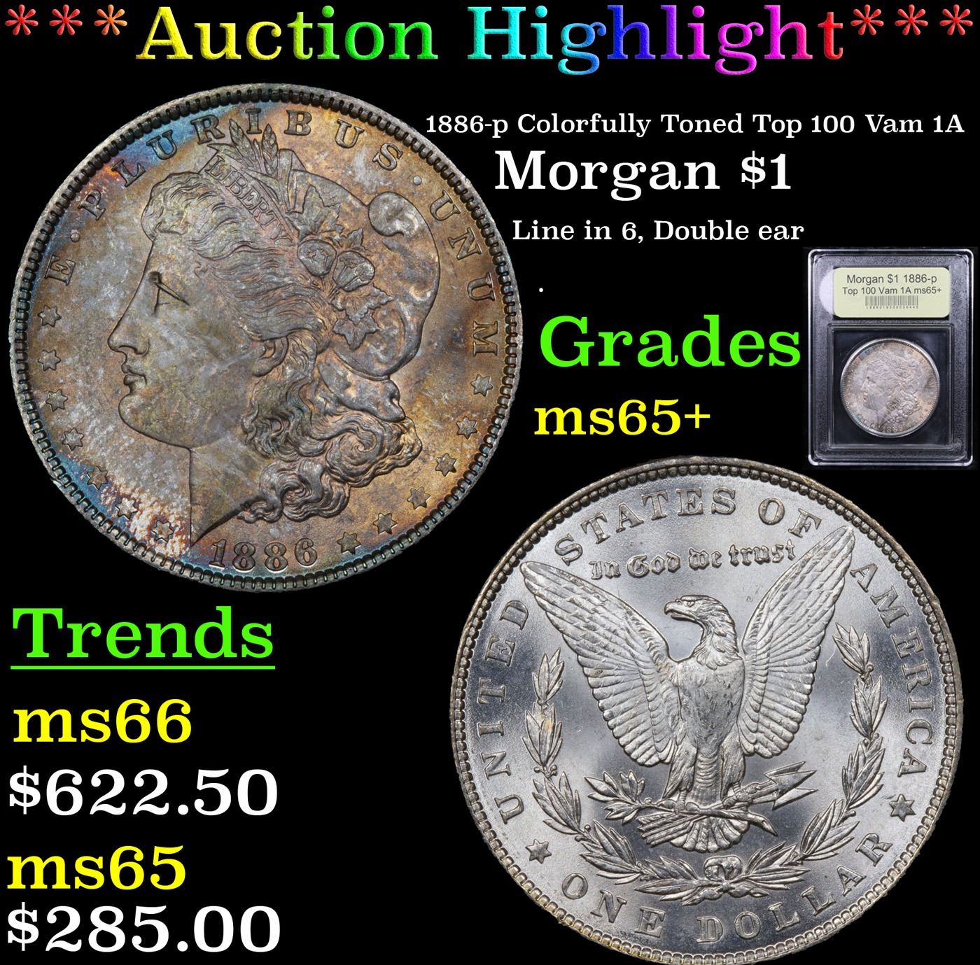 ***Auction Highlight*** 1886-p Colorfully Toned Top 100 Vam 1A Morgan Dollar $1 Graded GEM+ Unc By U