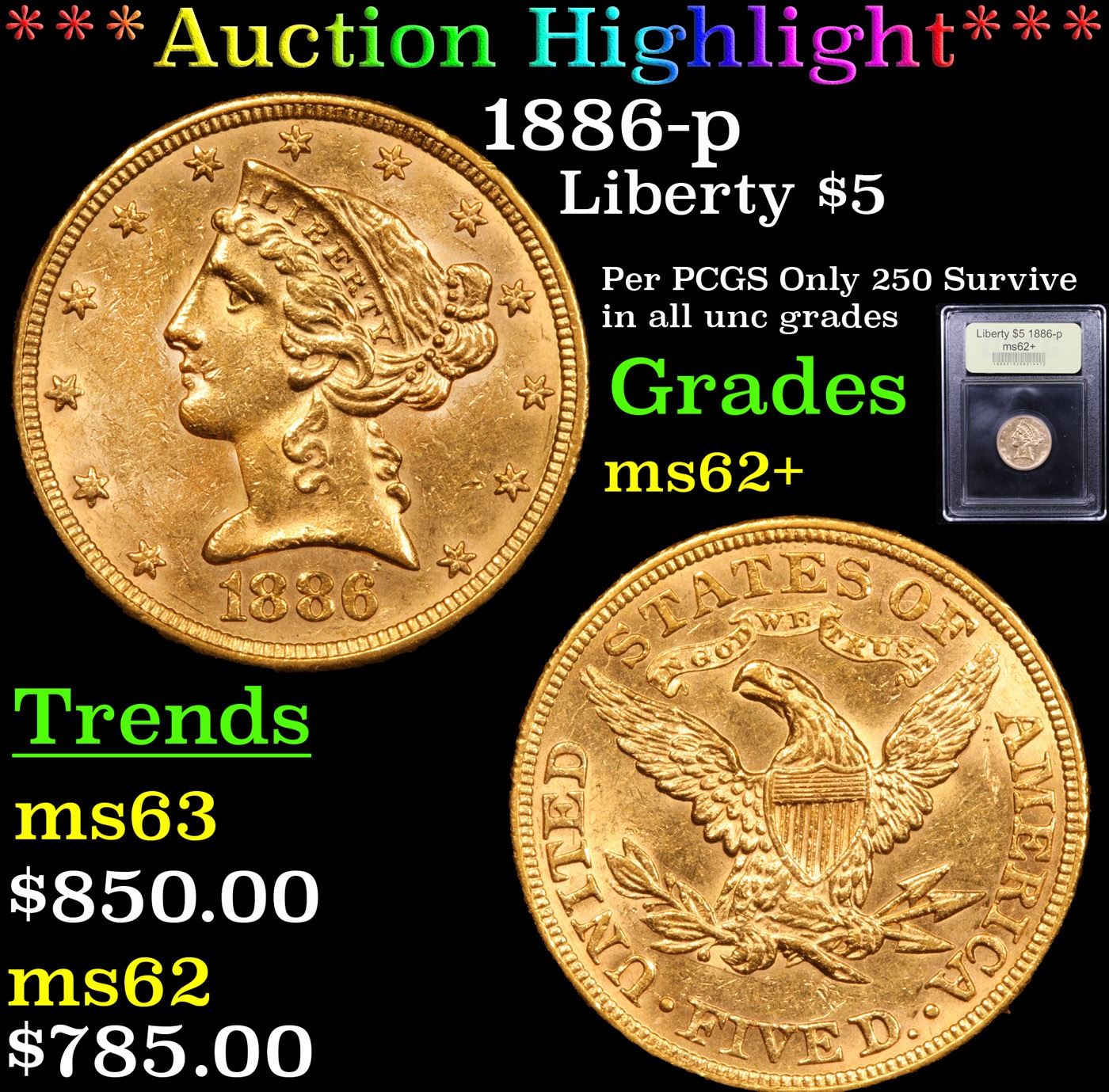 ***Auction Highlight*** 1886-p Gold Liberty Half Eagle $5 Graded Select Unc By USCG. Softly frosted rose-gold surfaces are sharply struck throughout the design. Like so many issues in the challenging Liberty Head half eagle series, the 1886 is underrated in all Mint State grades, this despite a relatively generous mintage of 388,360 circulation strikes. With few examples grading finer, this premium quality MS-62+ offers good value for the astute gold enthusiast. A Corey's Pick, Bid to Win Coin