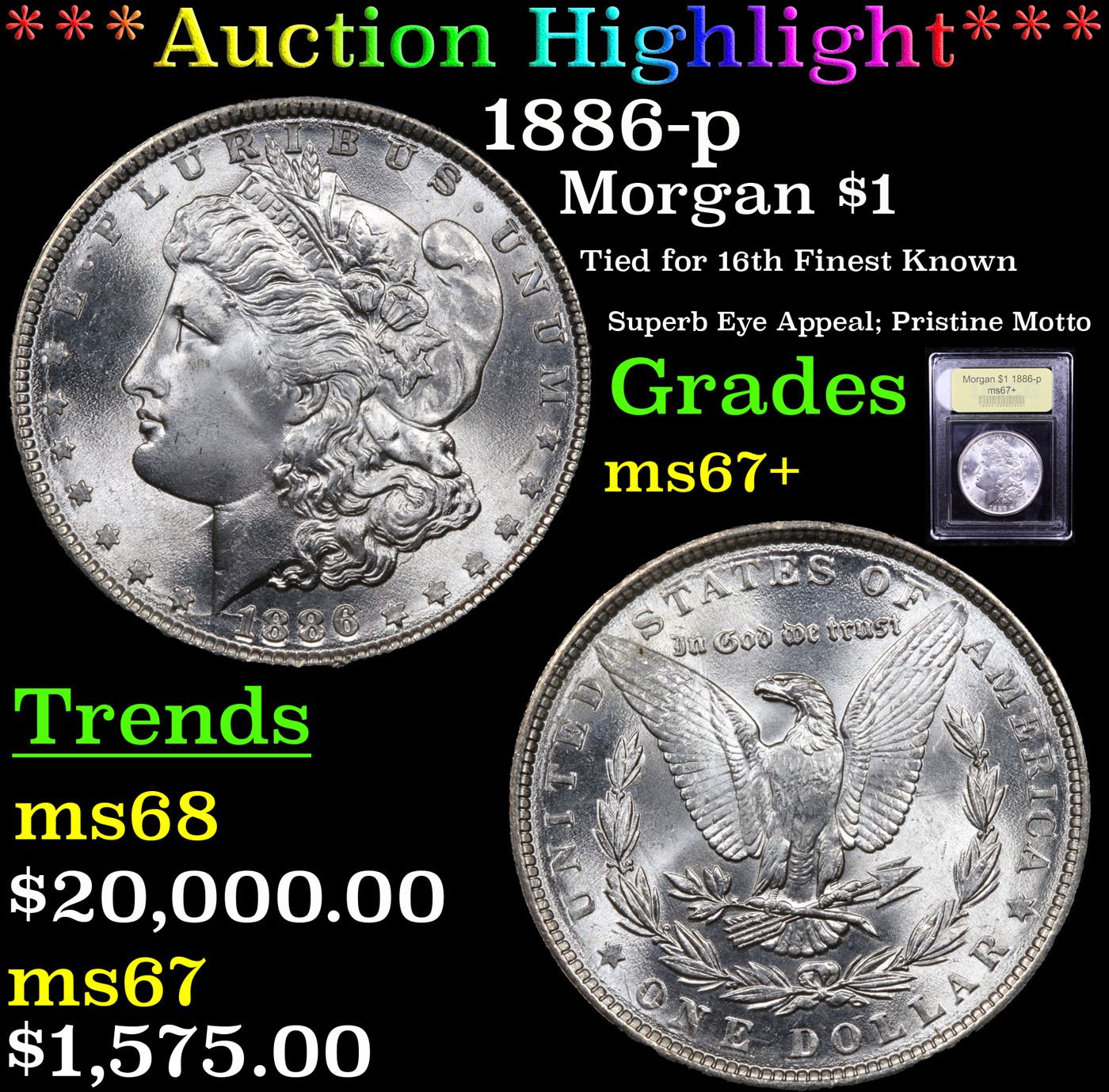 ***Auction Highlight*** 1886-p Morgan Dollar $1 Graded Gem++ Unc By USCG. This is a bright, virtually brilliant example with intense satin to flashy frosted luster. Sharply struck with smooth and appealing surfaces. At 19,963,000 circulation strikes produced, the 1886 has the highest mintage for a silver dollar of any design type produced up to that time. Thanks to the release of large numbers of examples from government storage throughout much of the early to mid-20th century, the 1886 is one of the most available Morgan dollars in Mint State. As with so many issues in this series, however, the 1886 becomes scarce to rare in the finest Mint State grades, which for the 1886 means MS-67+ and finer. Among the nicest examples that we have offered in recent sales, this virtually pristine beauty would do justice to any high quality collection. Tied for 16th finest. A Corey's Pick, Bid to Win, Don't let it get Away, you might not find its equal Coin. I give this coin my highest recommendation