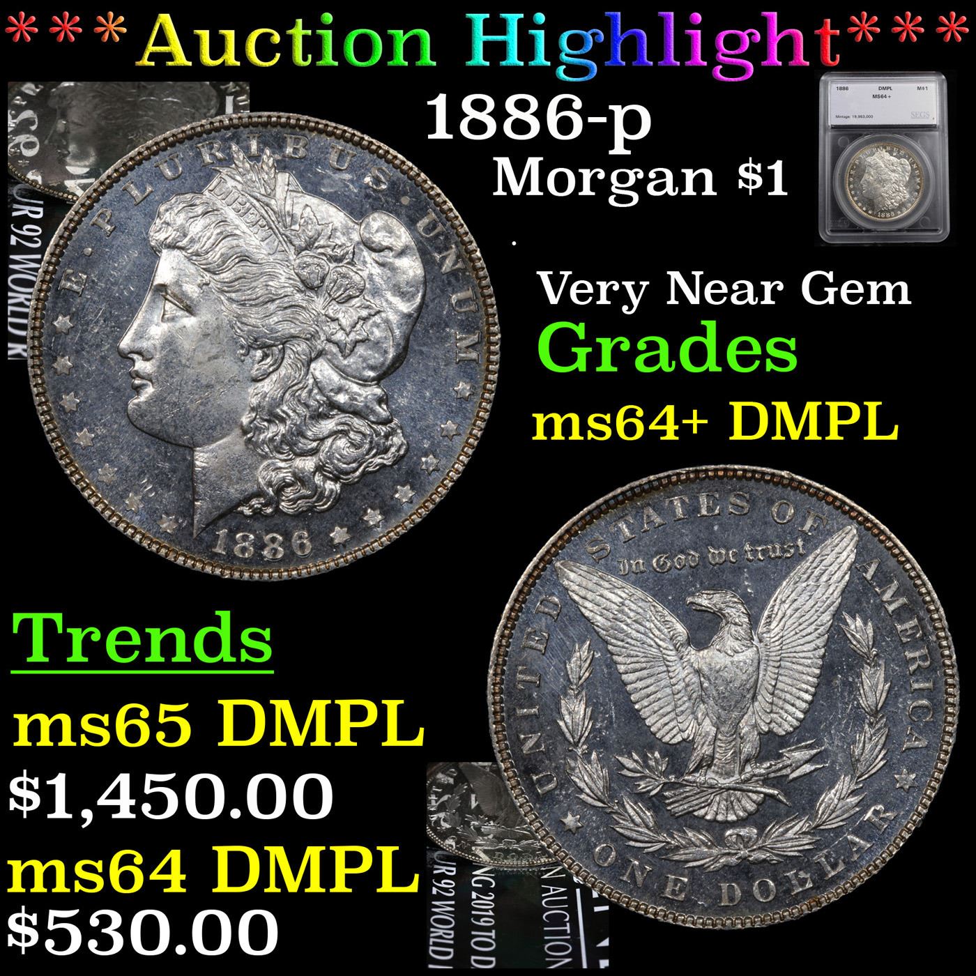 ***Auction Highlight*** 1886-p Morgan Dollar $1 Graded ms64+ DMPL By SEGS. A Corey's Pick, Bid to Win Coin