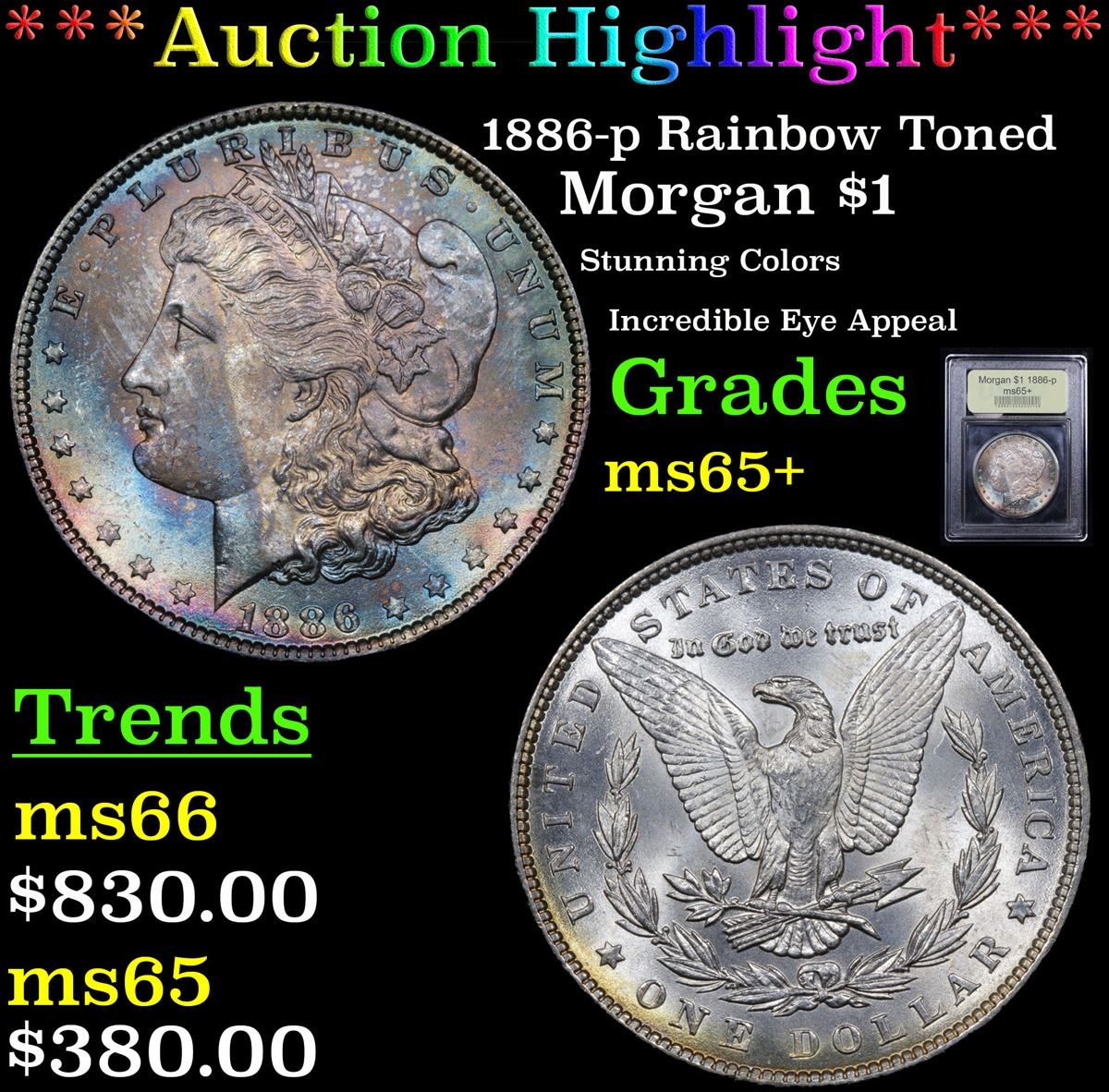 ***Auction Highlight*** 1886-p Rainbow Toned Morgan Dollar $1 Graded GEM+ Unc By USCG. A Corey's Pick, Bid to Win, Don't let it get Away, you might not find its equal Coin. I give this coin my highest recommendation