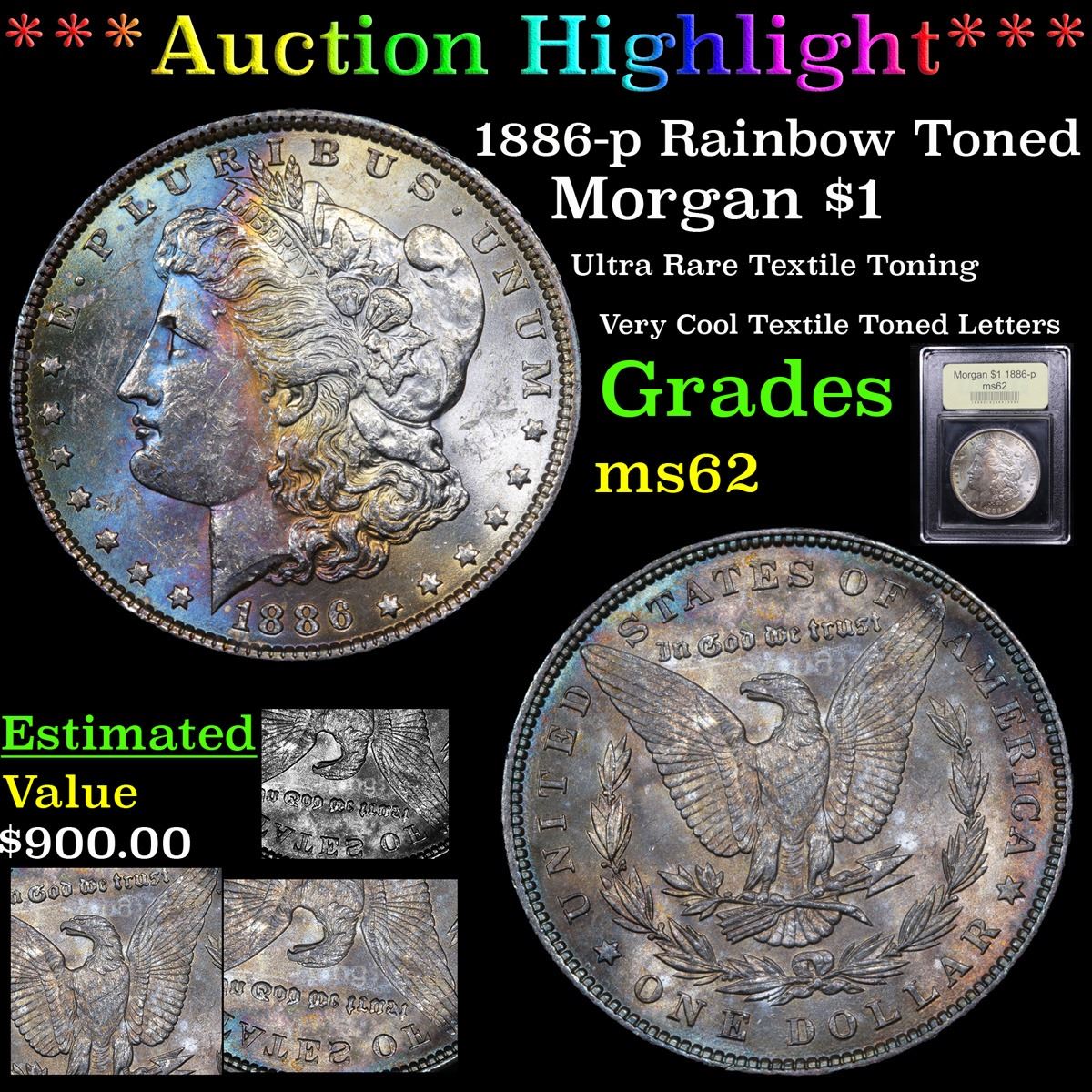 ***Auction Highlight*** 1886-p Rainbow Toned Morgan Dollar $1 Graded Select Unc By USCG. Up for auction is another coin from the same consignee as Lot 117. It is something I have never seen in all my years in numismatics. This 1886-p is not only beautifully and colorfully toned, it is has ultra rare and highly sought textile toning, but beyond that, it has the mirror imprint of what was printed on that long ago canvas bag. I have never before seen textile toning with letters transferred. After reversing the image and attempting to make the words stand out, the best I've come up with so far is “ping” Incredible coin, I estimate its value at $700-$900, but since I could not find any other coin with textile toning with letters transferred, except lot 117, which obviously was in the same canvas bag at one point in time, this coin could sell for higher to a toned Morgan collector! Good Luck. A Corey's Pick, Bid to Win, Don't let it get Away, you might not find its equal Coin