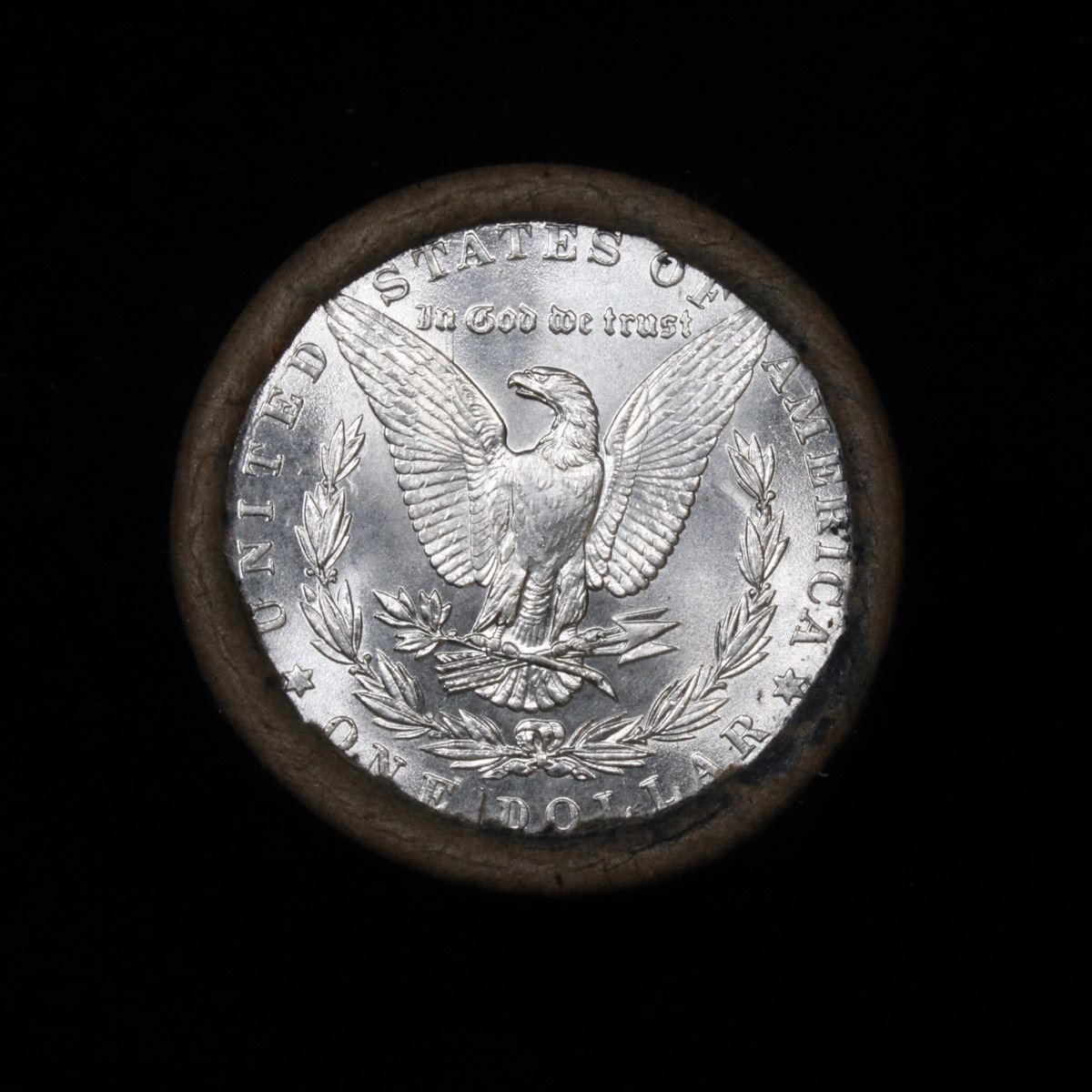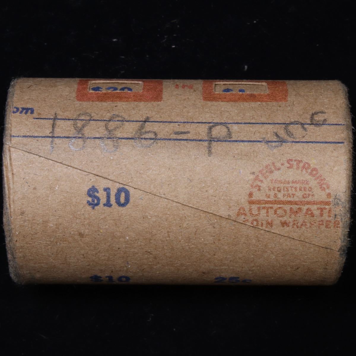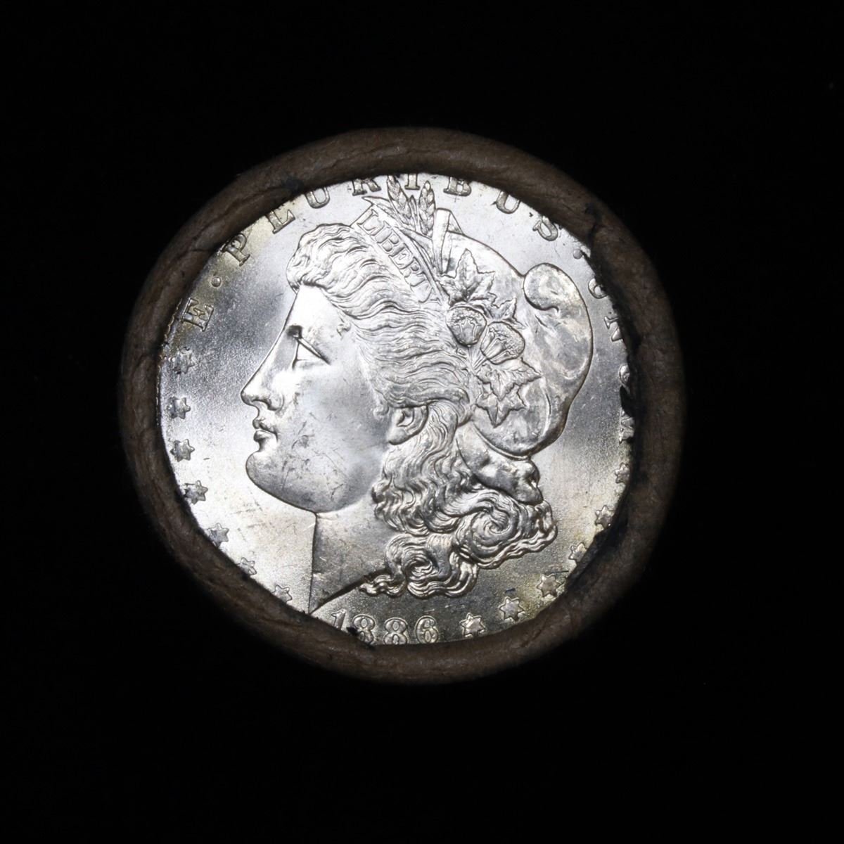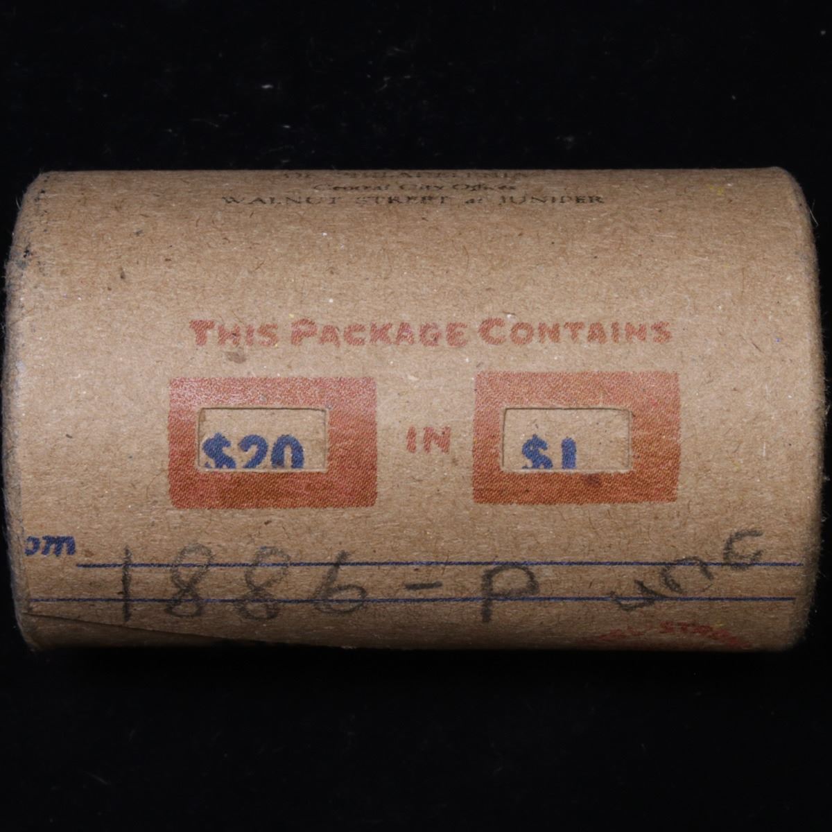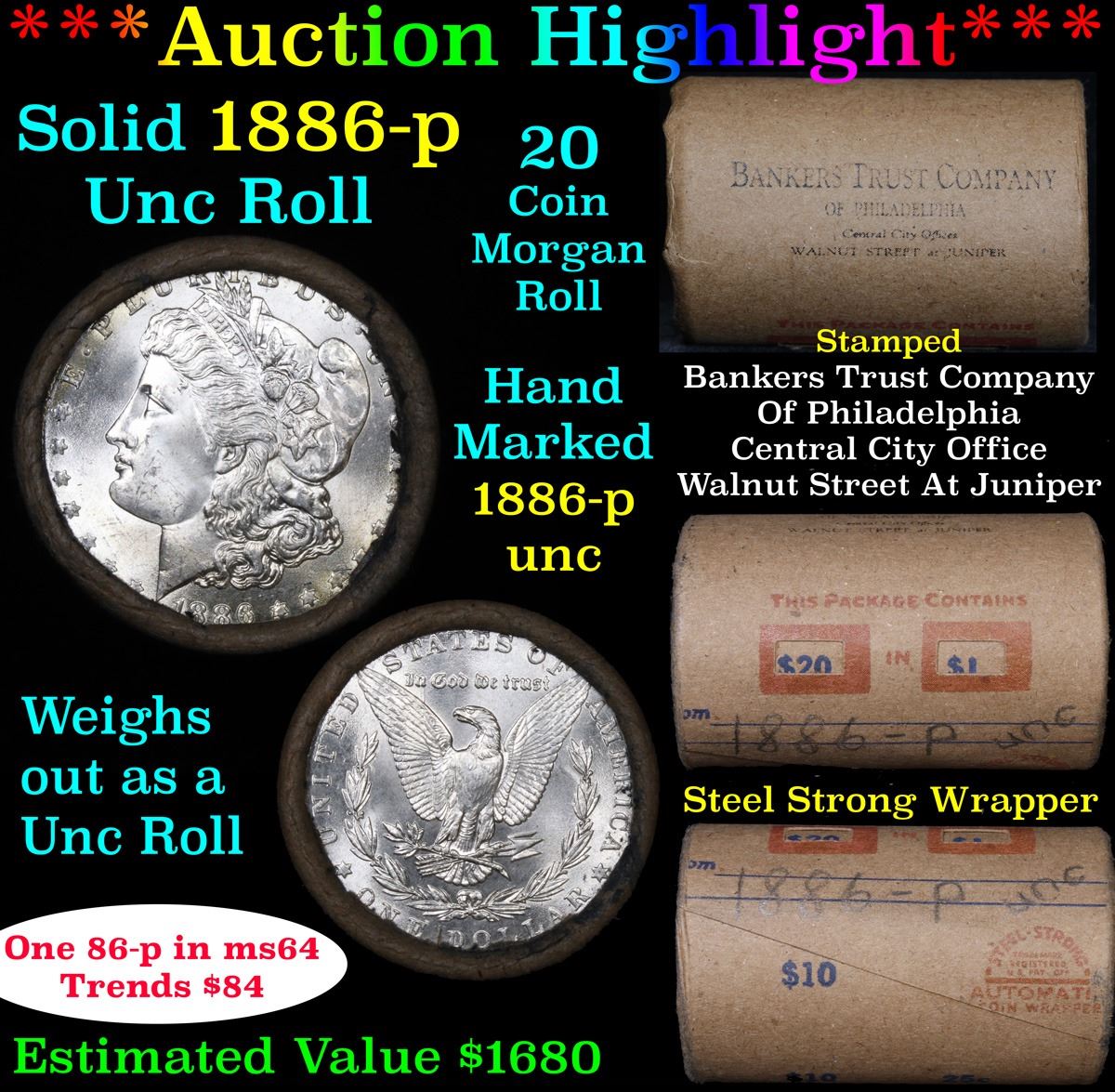 ***Auction Highlight*** 1886-p Uncirculated Morgan Dollar Shotgun Roll. This roll is held in an old Steel strong wrapper, patented 1921, stamped "Bankers Trust Company of Philadelphia, Walnut Street at Juniper. 1886-p Uncirculated Morgan Dollar Roll, Superb Ends. Weighs Perfectly as an Uncirculated Roll. Trends in ms64 is $85 and ms63 is $75. One ms67 is $1000 and one ms68 is $16,500.
