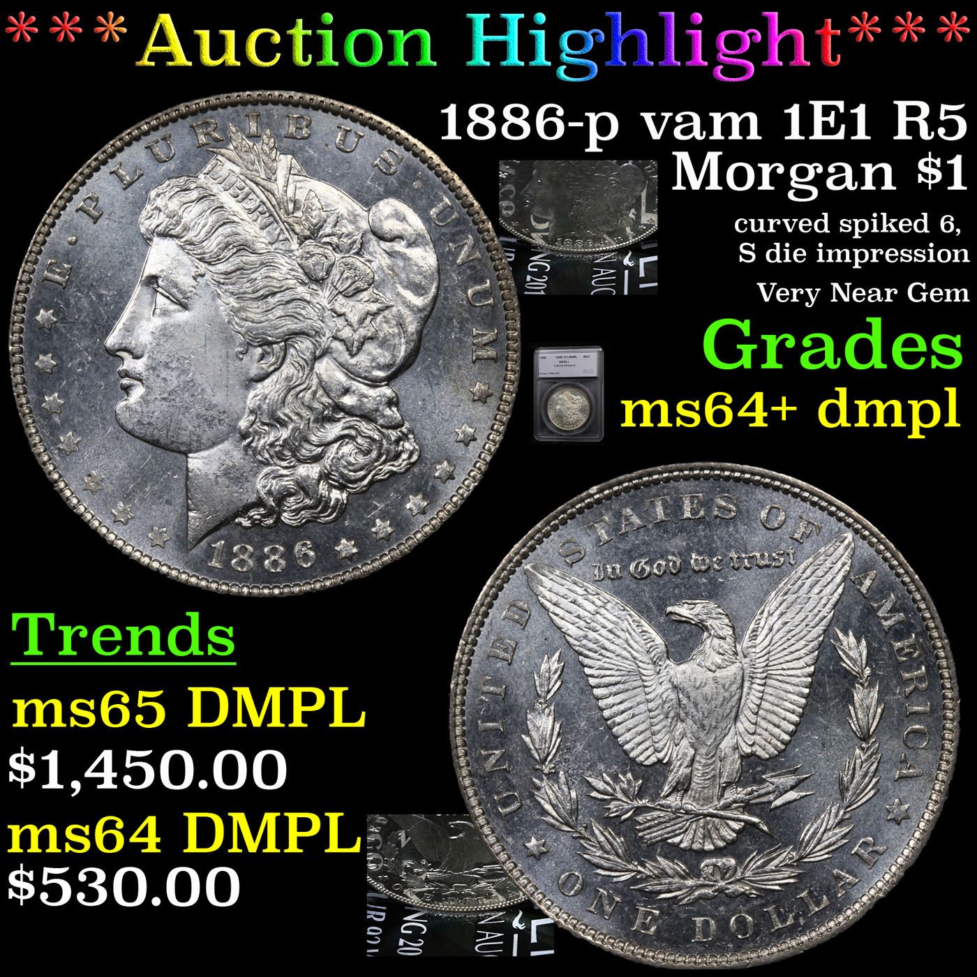 ***Auction Highlight*** 1886-p vam 1E1 R5 Morgan Dollar $1 Graded ms64+ dmpl By SEGS.