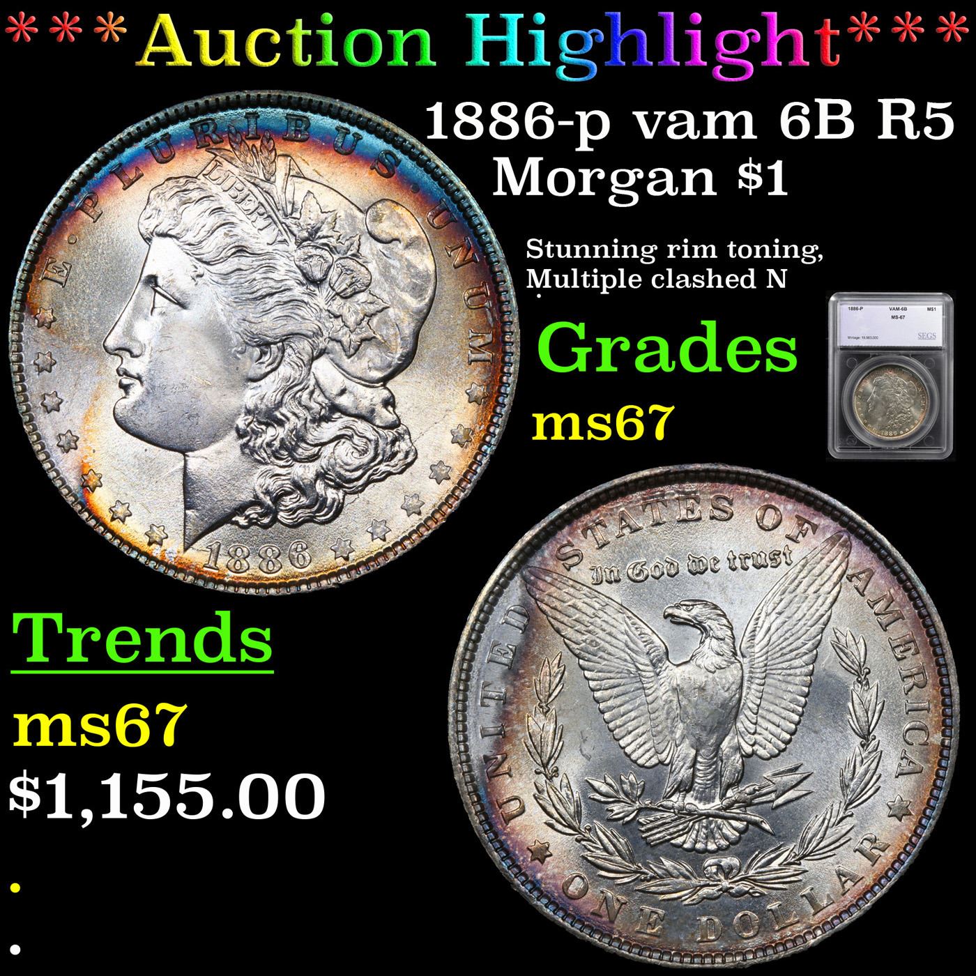 ***Auction Highlight*** 1886-p vam 6B R5 Morgan Dollar $1 Graded ms67 By SEGS. A Corey's Pick, Bid to Win, Don't let it get Away Coin