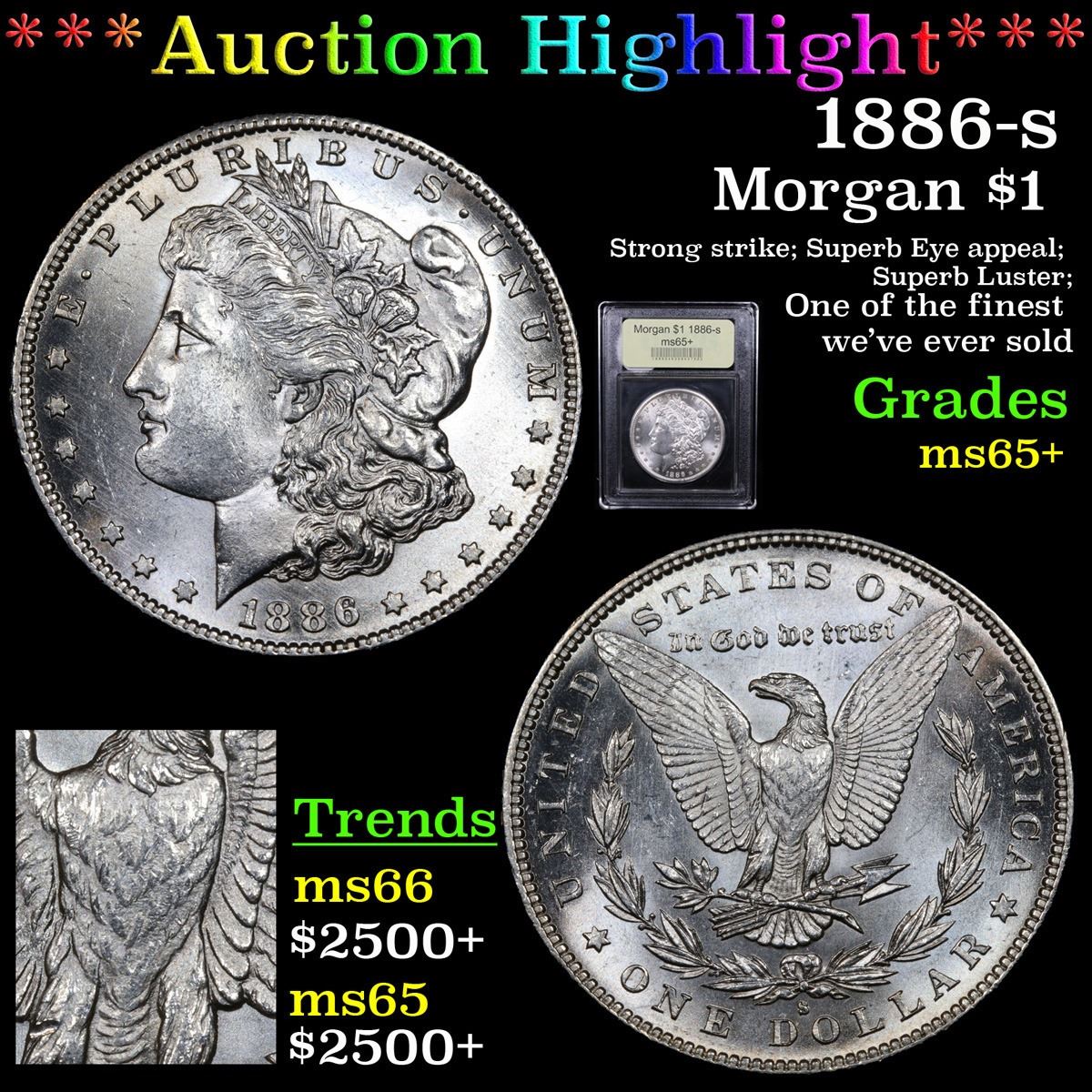 ***Auction Highlight*** 1886-s Strong strike; Superb Eye appeal; Superb Luster; One of the finest we've ever sold Morgan Dollar $1 Graded GEM+ Unc By USCG. A Corey's Pick, Bid to Win, Don't let it get Away, you might not find its equal Coin. I give this coin my highest recommendation
