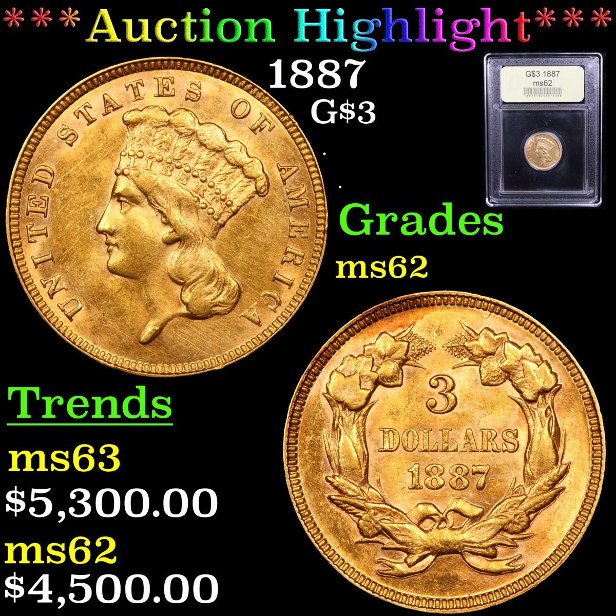 ***Auction Highlight*** 1887 Three Dollar Gold .$3 Graded Select Unc By USCG. 0