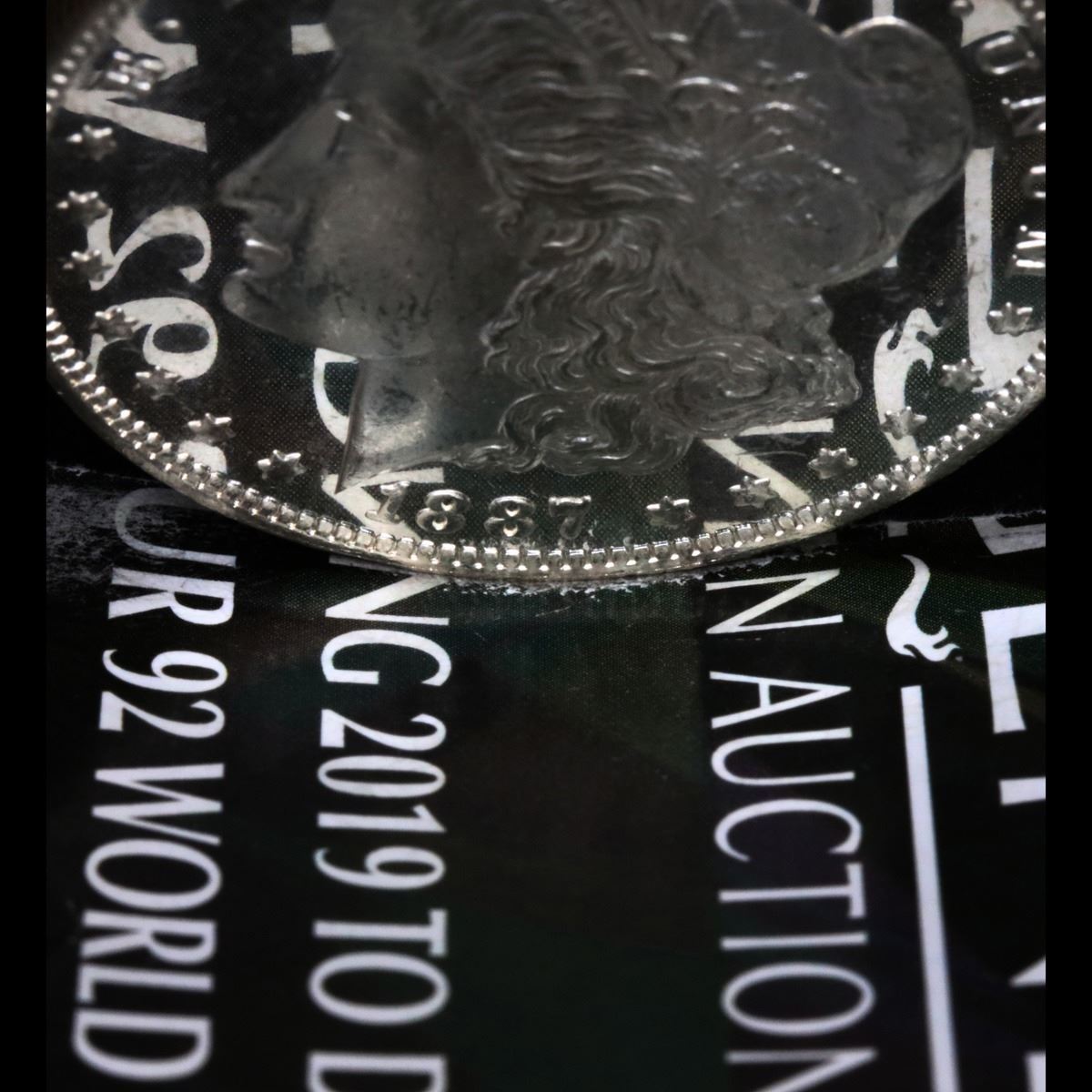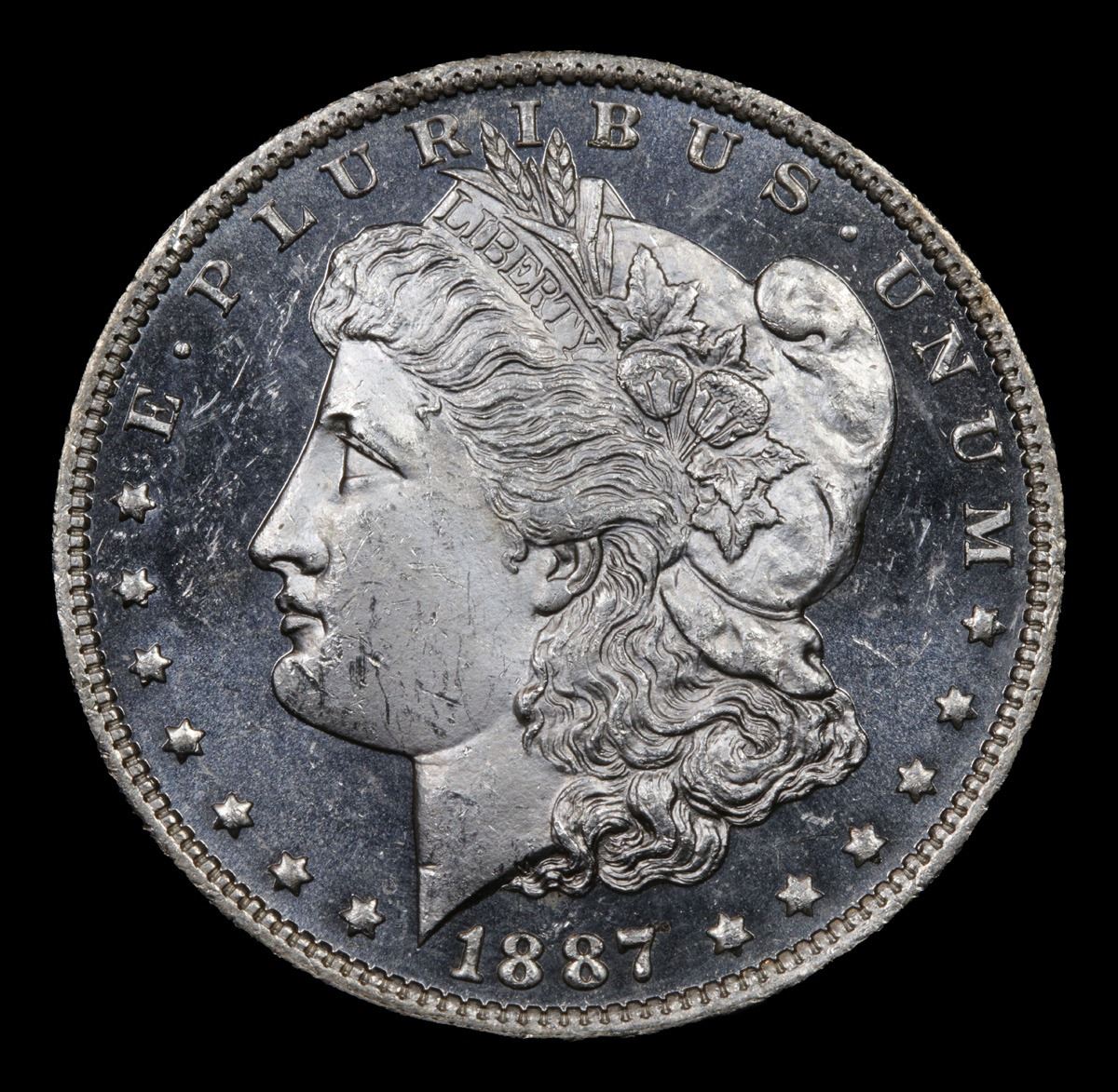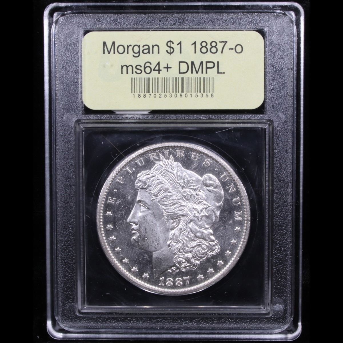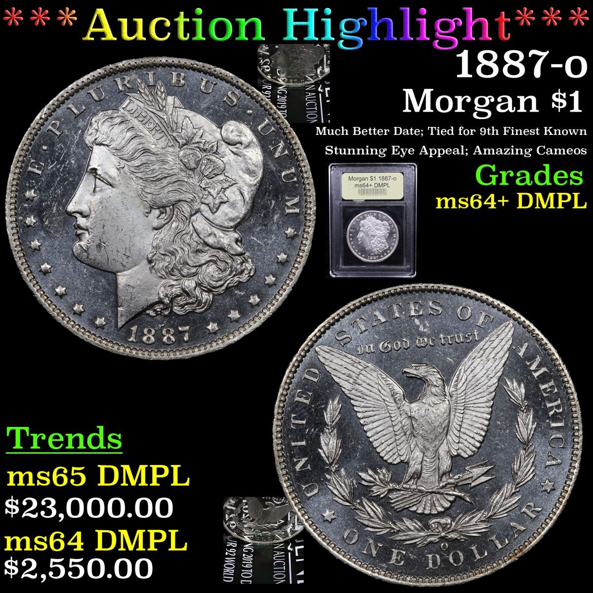 ***Auction Highlight*** 1887-o Morgan Dollar $1 Graded Choice Unc+ DMPL By USCG. The New Orleans Mint struck a smallish mintage of 1.7 million Morgan dollars in 1887 and survivors are seldom found in the higher reaches of Mint State. It seems the coins that were not released into circulation were roughly stored and transported from one government vault to another over the years, resulting in heavily bag marked surfaces on most examples seen. Although some high-quality examples turned up in the Redfield Hoard, few survivors are known with Proof like or Deep Mirror Proof like designations.The present coin is a spectacular Near Gem, with sharply detailed design elements and well-preserved, brilliant surfaces throughout. The fields exhibit deep proof like reflectivity on both sides. Eye appeal is outstanding. Tied for 9th Finest. A Corey's Pick, Bid to Win, Don't let it get Away, you might not find its equal Coin. I give this coin my highest recommendation