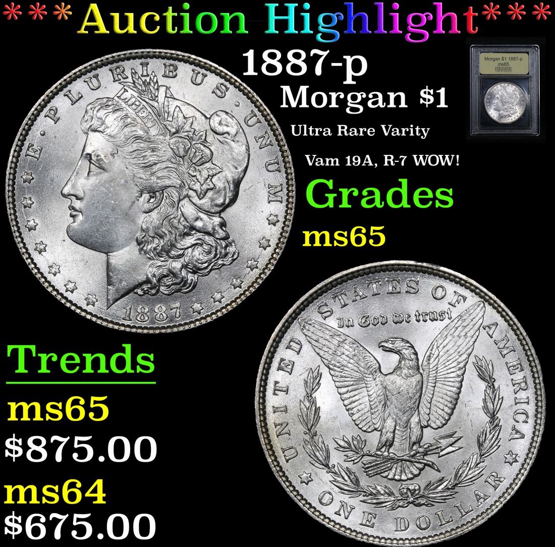 ***Auction Highlight*** 1887-p Morgan Dollar $1 Graded GEM Unc By USCG. Ultra Rare Varity Vam 19A, R-7 WOW! Possible Finest Known Vam 19 A, Slanted Date, Cool Die Break, Star Break; R-7A Corey's Pick, Bid to Win, Don't let it get Away, you might not find its equal Coin. I give this coin my highest recommendation