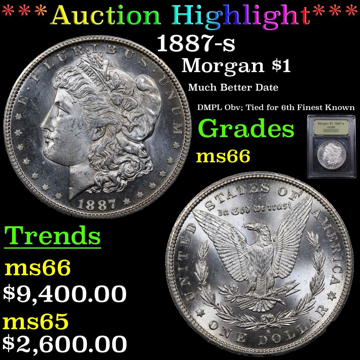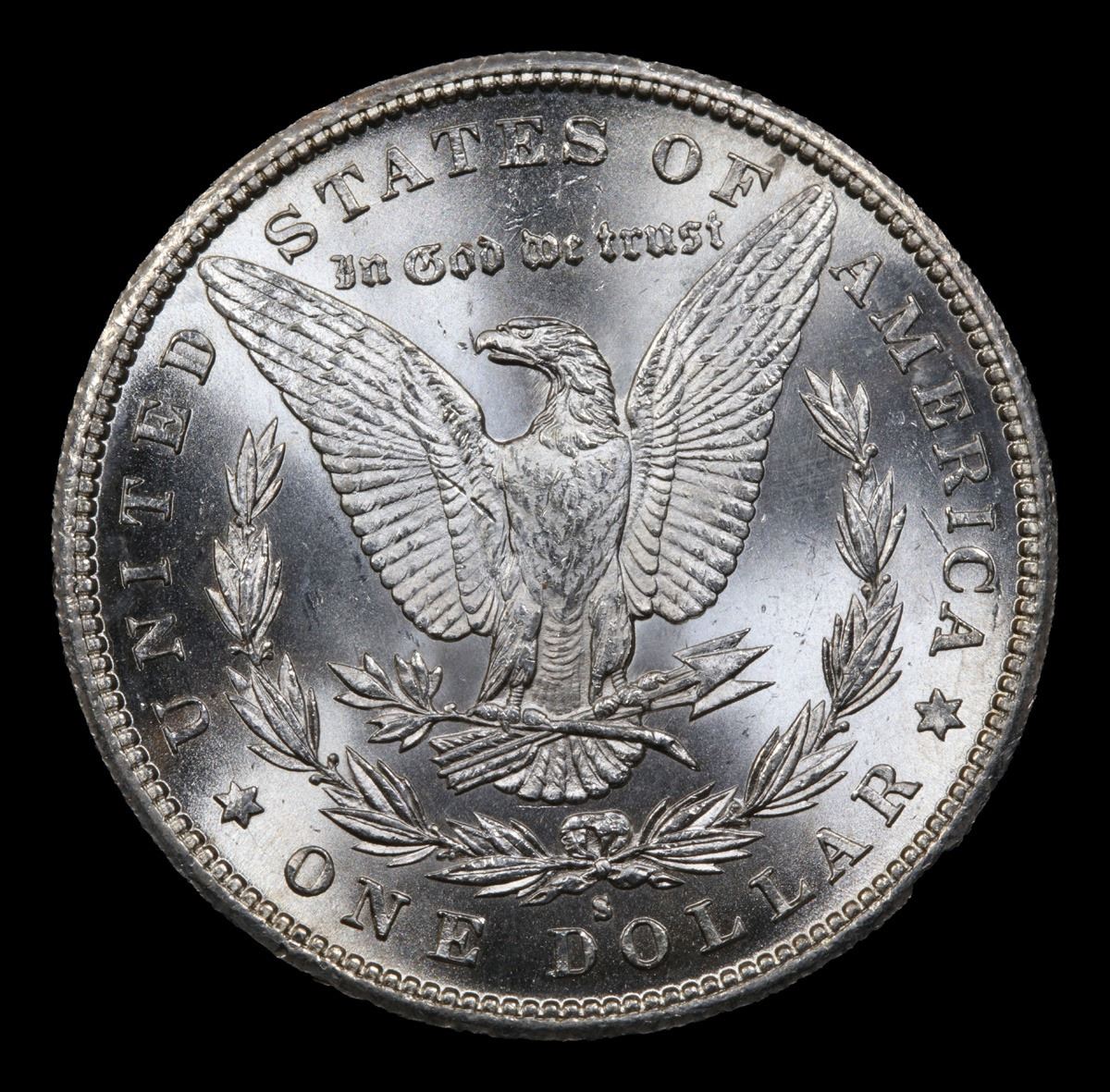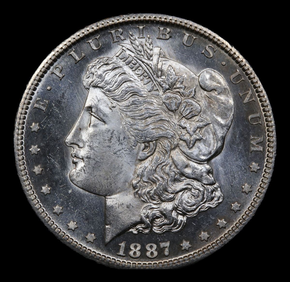 Tied for 6th Finest Known . Brilliant, sharply struck and Deep Mirror proof like on the Obverse. The 1887-S is a lower mintage (1,771000 pieces) issue for its type and was not represented to an appreciable extent in the Treasury Department silver dollar releases of 1962 to 1964. Quantities were available from government storage in earlier decades, but by the late 1950s the scarcity of this issue was already recognized. The LaVere Redfield hoard, dispersed in 1976, contained five to 10 bags, of which the vast majority of Uncirculated coins were in lower grades through MS-64 by today's standards. The coin offered here is rare from a condition standpoint and is sure to attract strong bids. A Corey's Pick, Bid to Win, Don't let it get Away, you might not find its equal Coin. I give this coin my highest recommendation