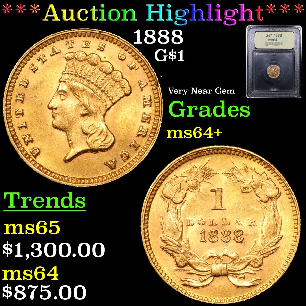 ***Auction Highlight*** 1888 . Very Near Gem Gold Dollar $1 Graded Choice+ Unc By USCG.