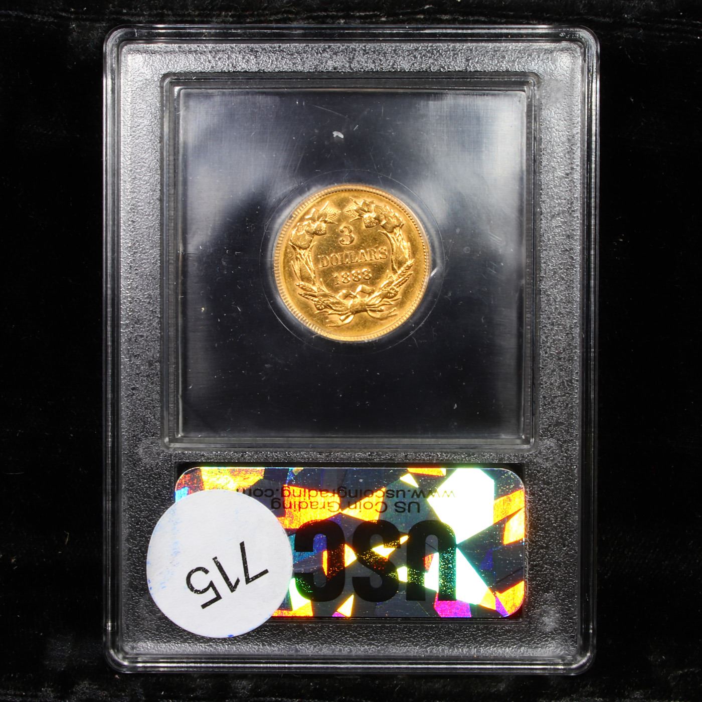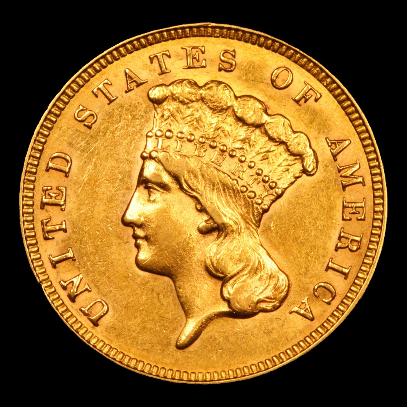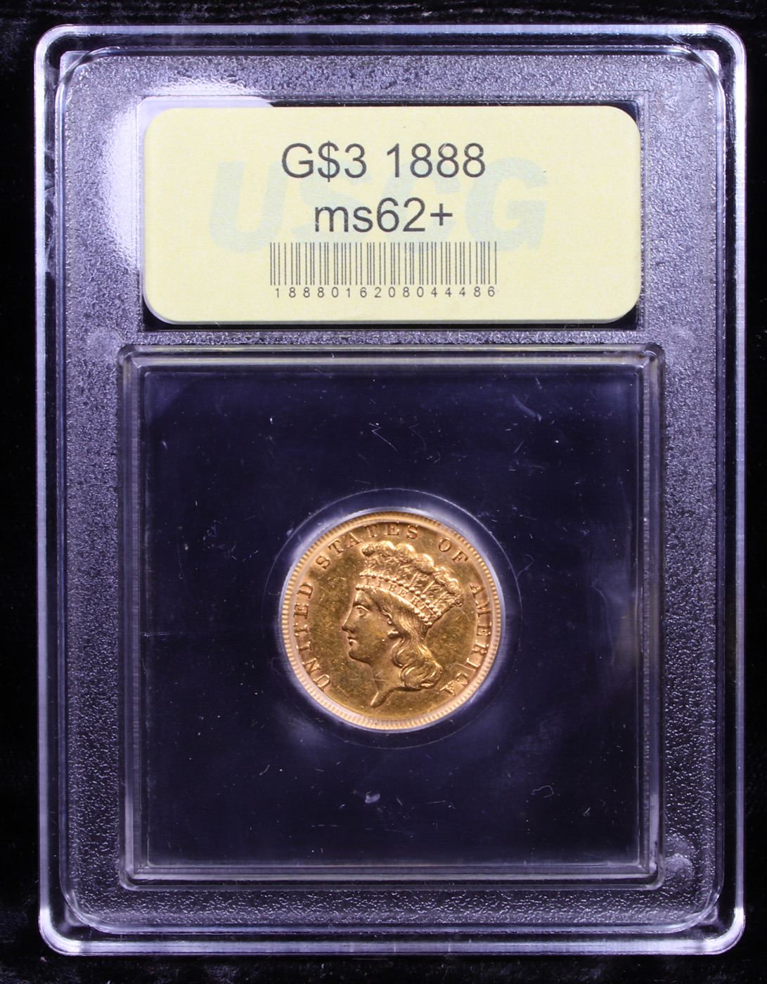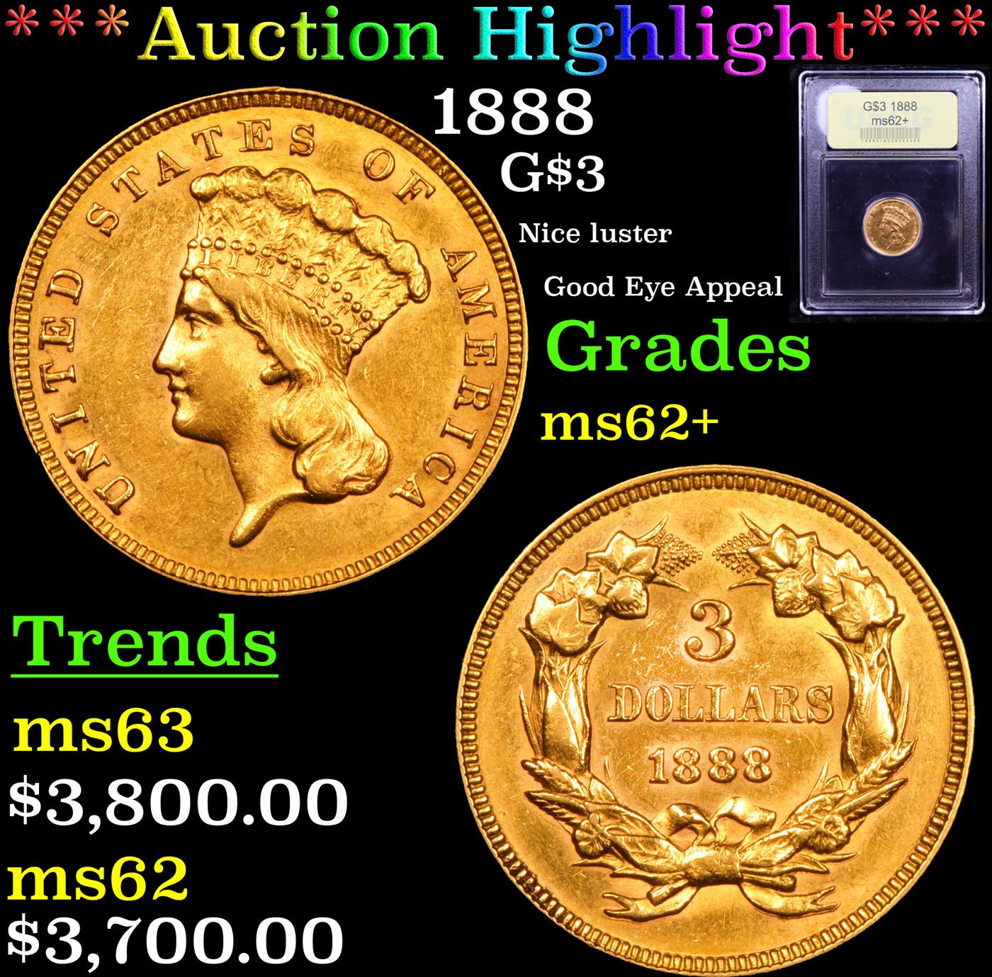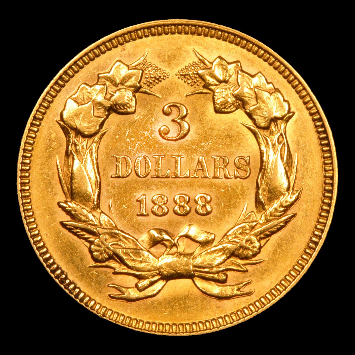 ***Auction Highlight*** 1888 Three Dollar Gold 3 Graded Select Unc By USCG. 0 Softly frosted luster blends with warm medium gold patina on both sides of this handsome BU example. Among the most available three-dollar gold issues from the 1880s, the extant population of the 1888 has long provided Mint State coins for collections. The mintage of 5,000 circulation strikes was only nominally smaller than that of the preceding year and it is thought some 350 to 450 examples of the date can be found in Mint State, attesting to the fact that many examples were set aside by contemporary dealers. However, availability dwindles rapidly as one progresses up the numismatic grading scale, this attractive MS-62+ representing good value for the sharp-eyed numismatist.