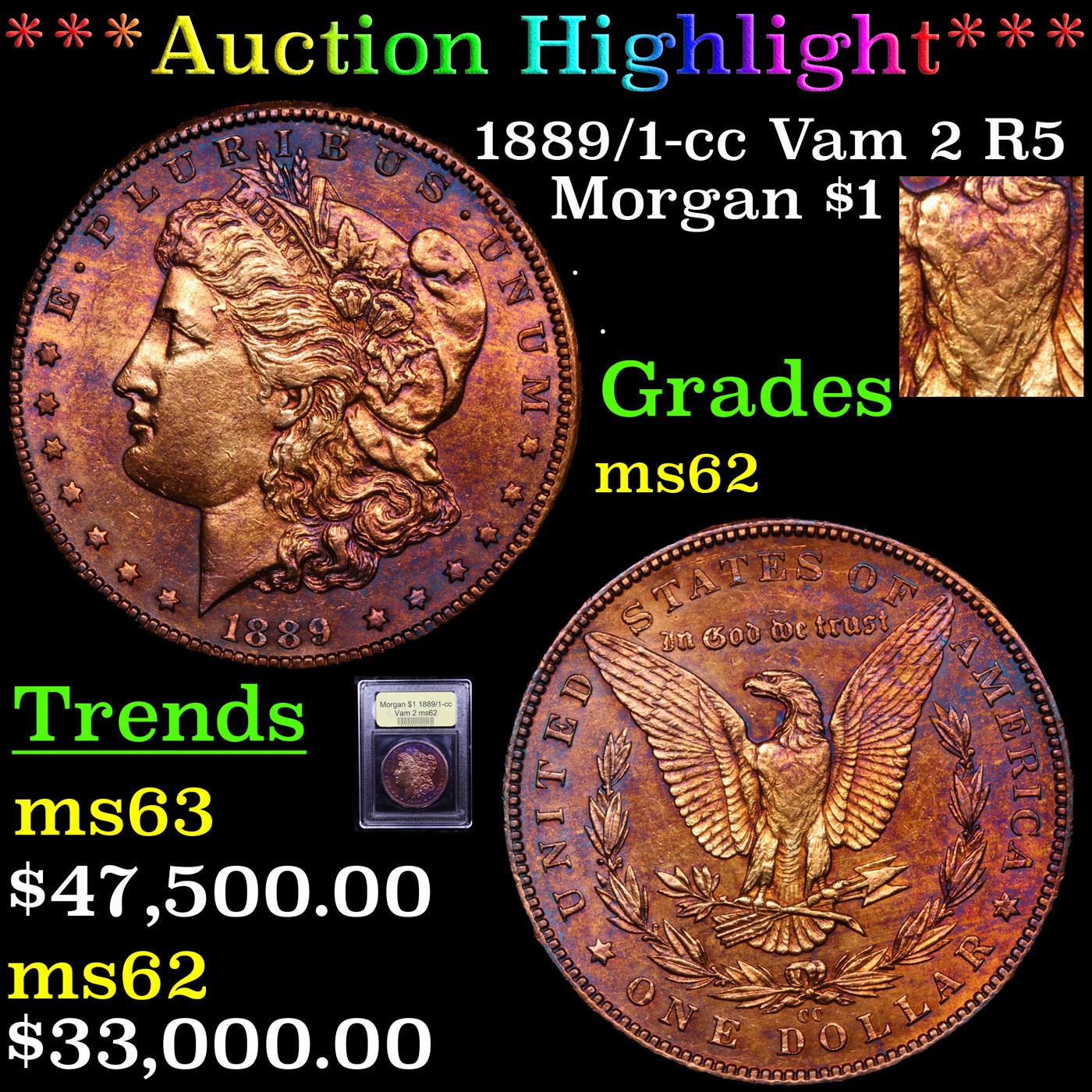 ***Auction Highlight*** 1889/1-cc Vam 2 R5 Morgan Dollar $1 Graded Select Unc by USCG. The low-mintage 1889-CC dollar is the key to the Carson City series of Morgans. Only 350,000 pieces were struck, and the number of survivors is heavily skewed toward circulated, and heavily circulated coins. Mint State examples are seldom located, simply because there was little or no reason for contemporary collectors to set them aside. By the time collecting Morgan dollars became popular the 1889-CC date and mintmark combination had been in circulation for decades. Small groups were paid out of the Treasury in 1933 and 1934, and a couple of bags were still in existence in the early 1960s, but Mint State pieces are elusive in auctions today. This is an all-brilliant example that is well-struck. A number of smaller abrasions are scattered over each side, as one would expect for an MS62, but the mint luster is radiant and heavily frosted A Corey's Pick, Bid to Win, Don't let it get Away, you might not find its equal Coin. I give this coin my highest recommendation