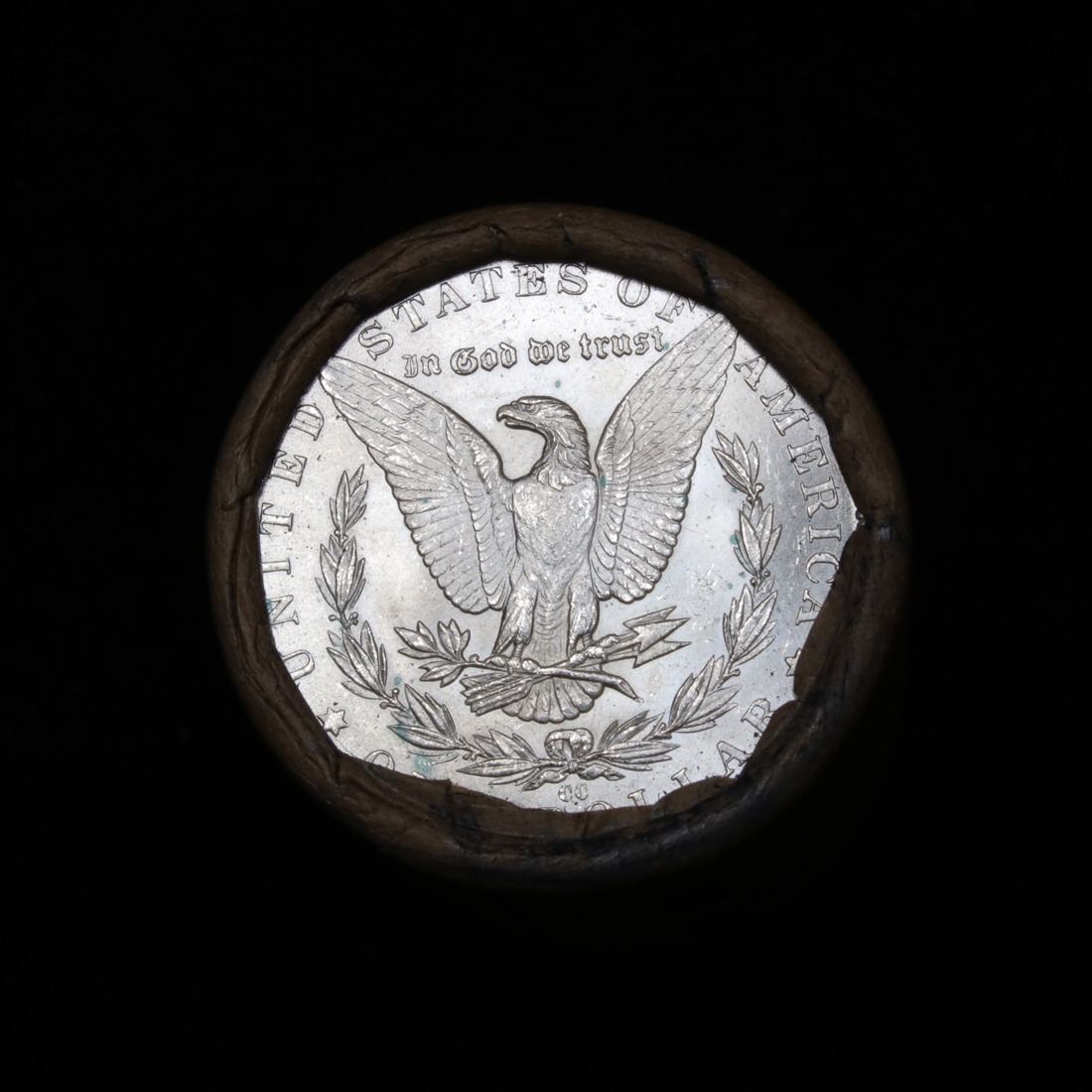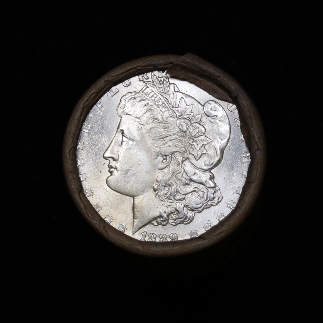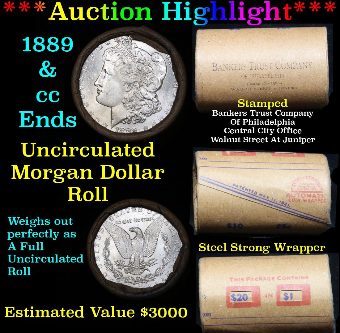***Auction Highlight*** 1889 & CC Uncirculated Morgan Dollar Shotgun Roll . .. Uncirculated Morgan Dollar Roll, Superb Ends, Old Steel Strong Wrapper, Faintly Stamped Bankers Trust Company Of Philadelphia, Walnut St at Juniper. Weighs Perfectly as a Uncirculated Roll. The 1889 is ms63+/ms64 and the other end is a CC Reverse with flashy luster.