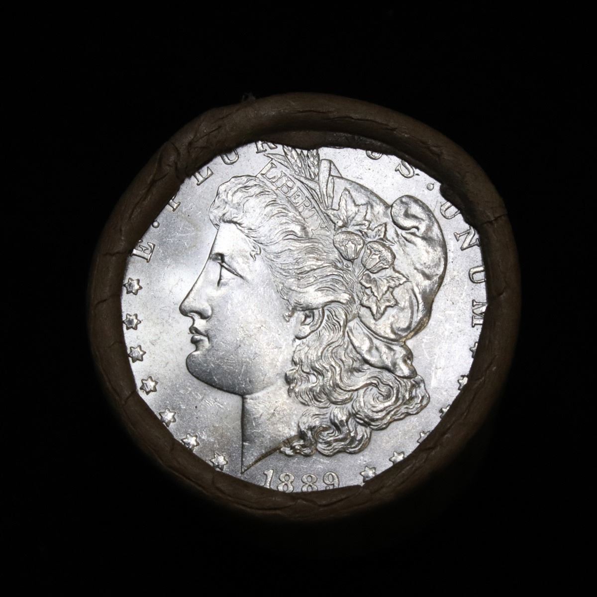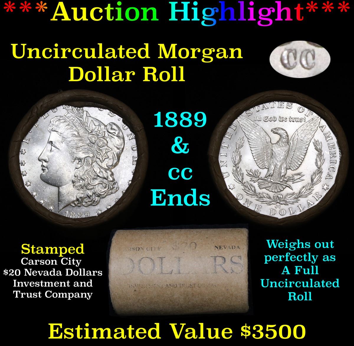 ***Auction Highlight*** 1889 & CC Uncirculated Morgan Dollar Shotgun Roll . .. Uncirculated Morgan Dollar Roll, Superb Ends, Carson City, Nevada Investment and Trust Co wrapper. Weighs Perfectly as a Uncirculated Roll. Great luster and super eye appeal on both ends.