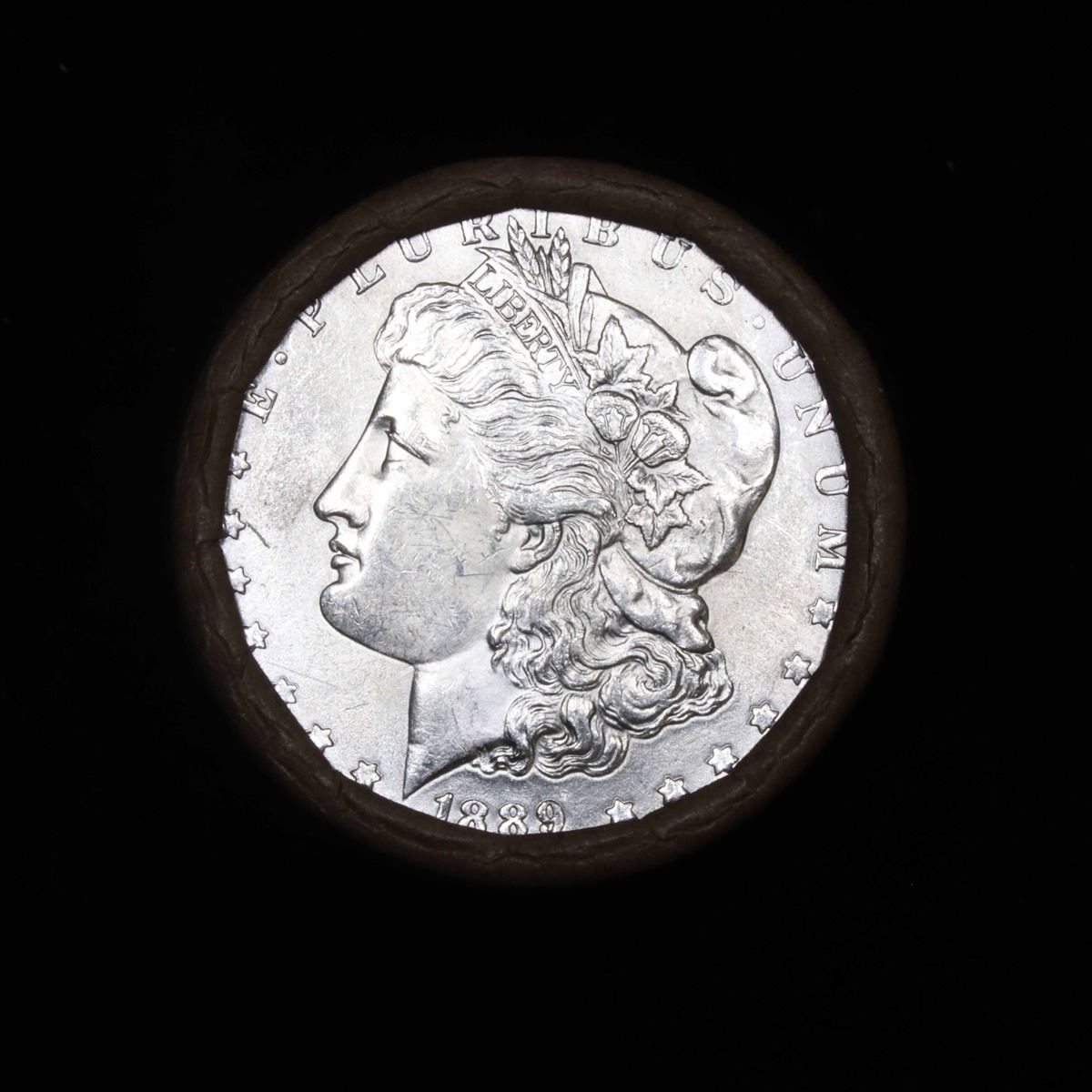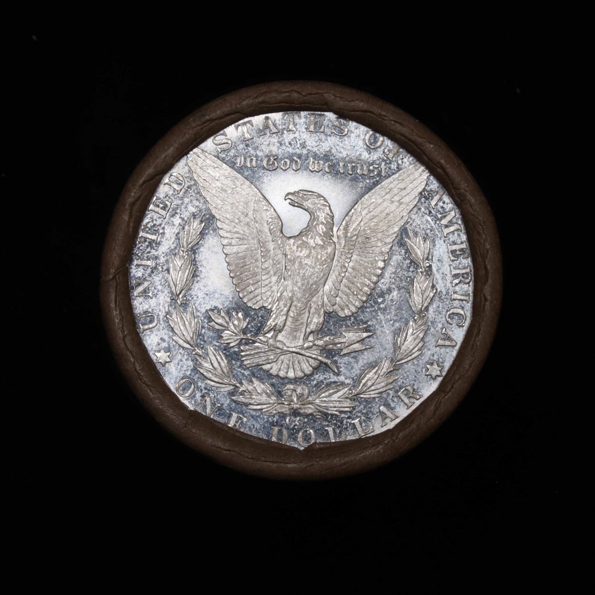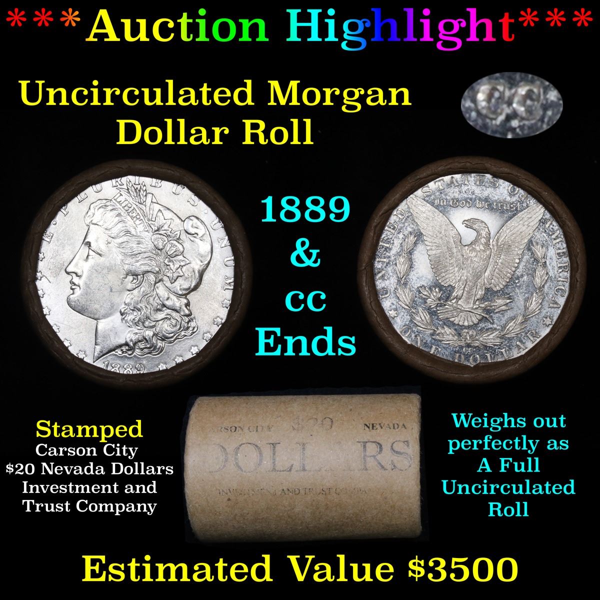 ***Auction Highlight*** 1889 & CC Uncirculated Morgan Dollar Shotgun Roll. Uncirculated Morgan Dollar Roll, Superb Ends, Carson City, Nevada Investment and Trust Co wrapper. Weighs Perfectly as a Uncirculated Roll. The CC end is DMPL.