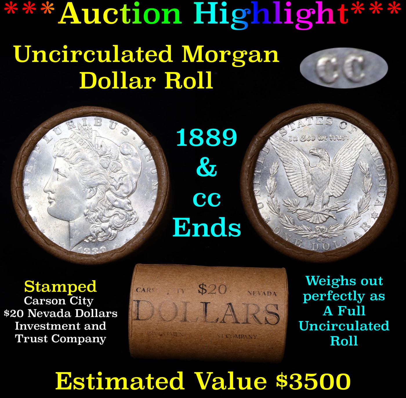 ***Auction Highlight*** 1889 & CC Uncirculated Morgan Dollar Shotgun Roll. Uncirculated Morgan Dollar Roll, Superb Ends, Carson City, Nevada Investment and Trust Co wrapper. Weighs Perfectly as a Uncirculated Roll.