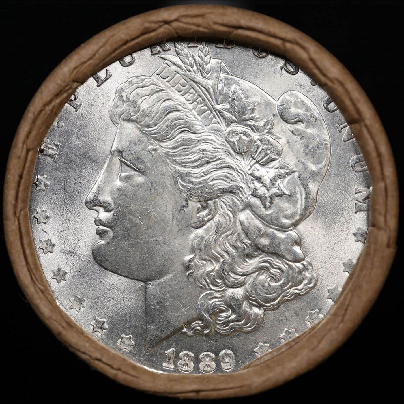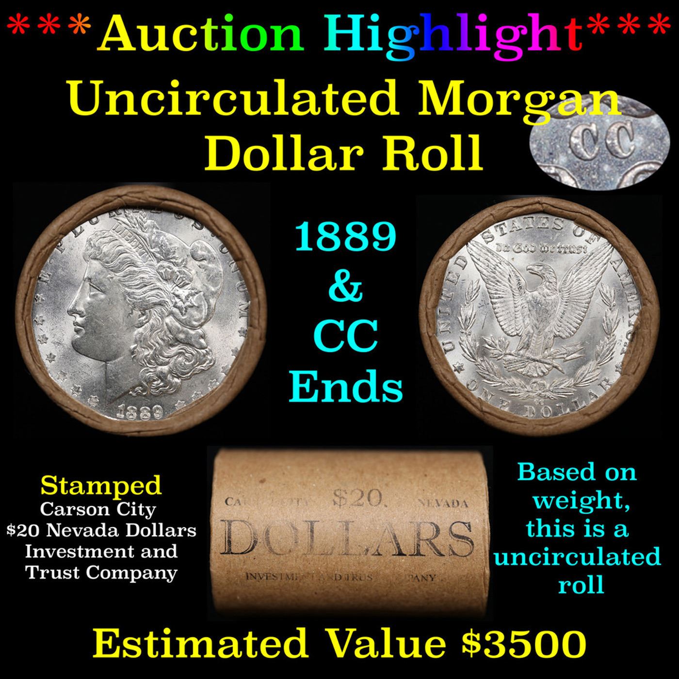 ***Auction Highlight*** 1889 & CC Uncirculated Morgan Dollar Shotgun Roll (fc) Uncirculated Morgan Dollar Roll, Superb Ends, Carson City, Nevada Investment and Trust Co wrapper. Weighs Perfectly as a Uncirculated Roll.