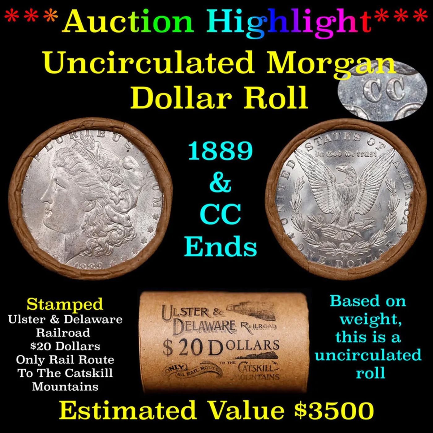 ***Auction Highlight*** 1889 & CC Uncirculated Morgan Dollar Shotgun Roll. Uncirculated Morgan Dollar Roll, Superb Ends In an old Ulster & Deleware Railroad to the Catskill Mountains wrapper. Weighs Perfectly as a Uncirculated Roll.