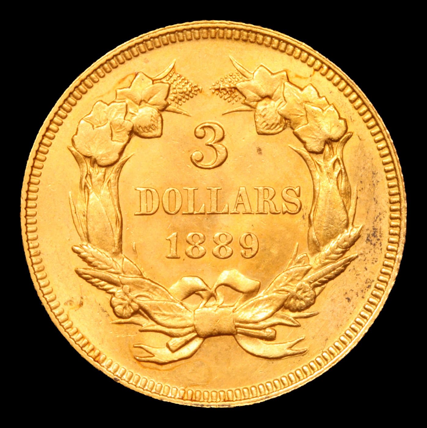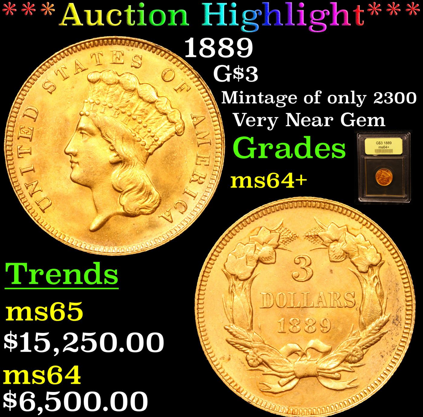 ***Auction Highlight*** 1889 Three Dollar Gold 3 Grades Choice+ Unc. This is an exceptionally well preserved and attractive example of the popular final year 1889 $3 gold issue. Gleaming straw-gold surfaces and rich luster provide this final-year near-Gem with exceptional eye appeal. We anticipate that strong bidding will be required to win this premium quality Gem. Circulation strike production for the final date of this denomination amounted to just 2,300 coins, down more than 50% from the previous year's mintage, all delivered by the coiner in December of the year (though a portion may never have been distributed). It is thought that 200 to 250 Mint State examples can be accounted for, along with 100 to 130 circulated pieces. The typical circulated specimen is AU. Fortunately for today's quality conscious numismatists, Uncirculated survivors of this date are fairly available in the numismatic marketplace, although we stress that most such examples grade no finer than MS-64. Indeed, finding another coin as nice as this one will require significant patience. A Corey's Pick, Bid to Win, Don't let it get Away Coin