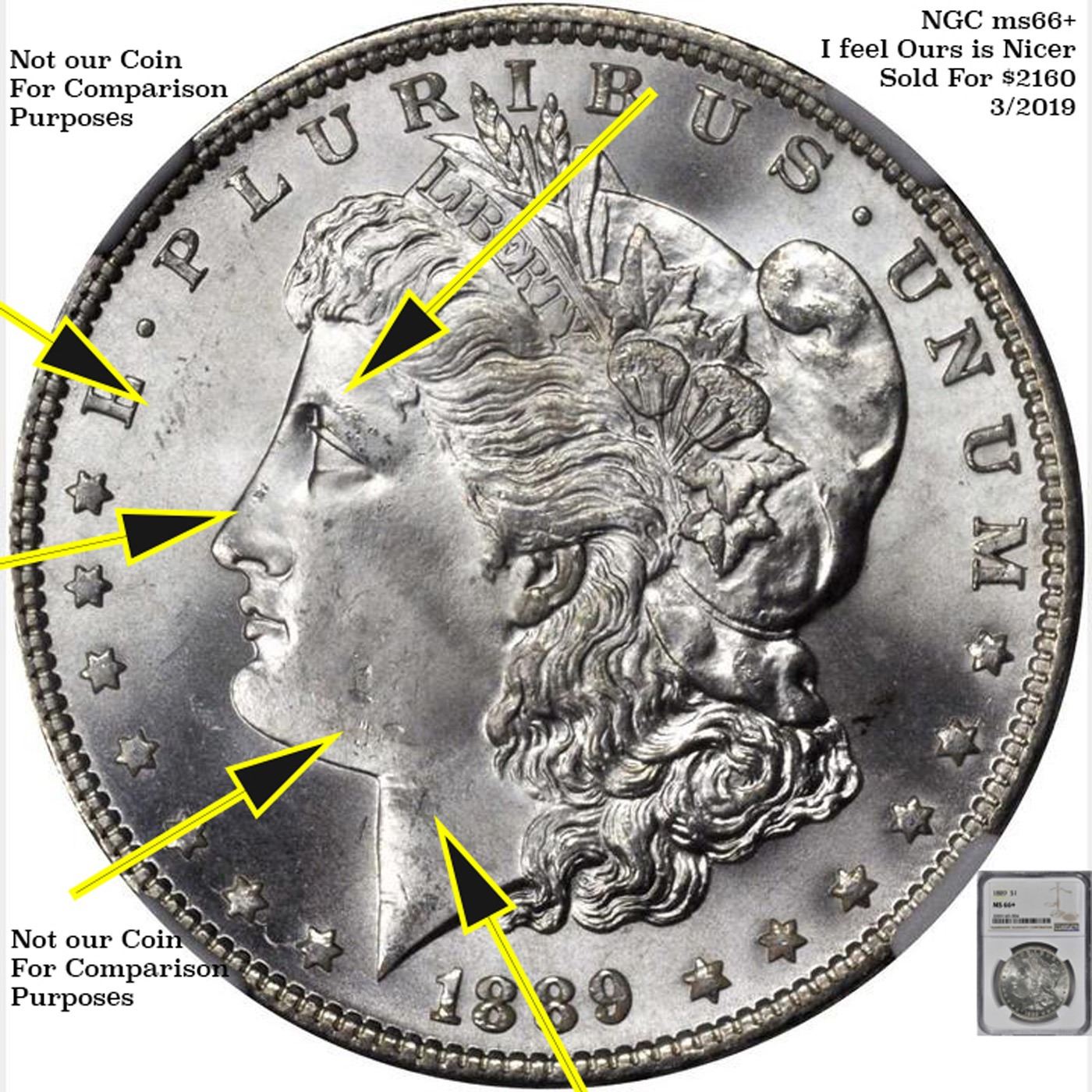 We DO NOT guarantee coin grades on any of our lots. Please study photos carefully and Video during the auction as well as asking questions before bidding. We may be reached at 856-685-9848 prior to the auction M-F 9am-5PM EST.