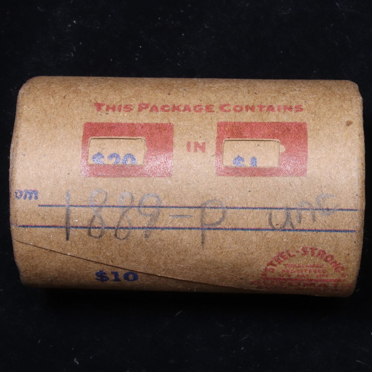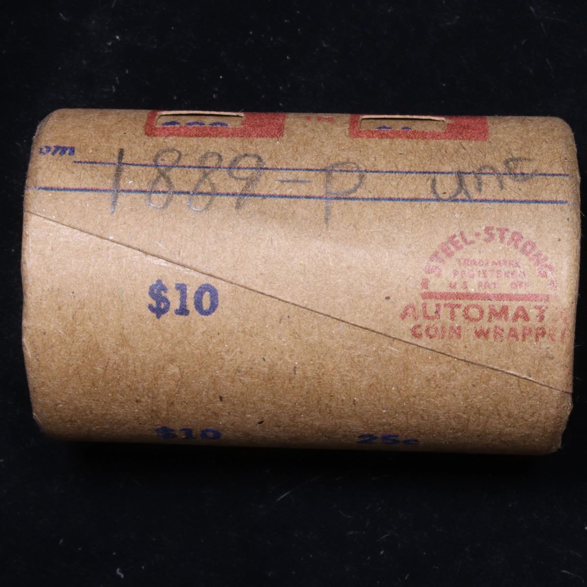 ***Auction Highlight*** 1889-p Uncirculated Morgan Dollar Shotgun Roll.        This roll is held in an old Steel strong wrapper, patented 1921, stamped "Bankers Trust Company of Philadelphia, Walnut Street at Juniper.  1889-p Uncirculated Morgan Dollar Roll, Superb Ends.  Weighs Perfectly as an Uncirculated Roll.  Trends lists ms64 at $85 and ms63 at $75.