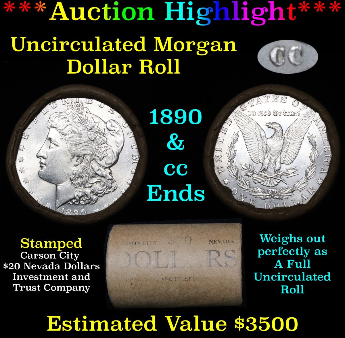 ***Auction Highlight*** 1890 & CC Uncirculated Morgan Dollar Shotgun Roll . .. Uncirculated Morgan Dollar Roll, Superb Ends, Carson City, Nevada Investment and Trust Co wrapper. Weighs Perfectly as a Uncirculated Roll. Great luster and super eye appeal on both ends.