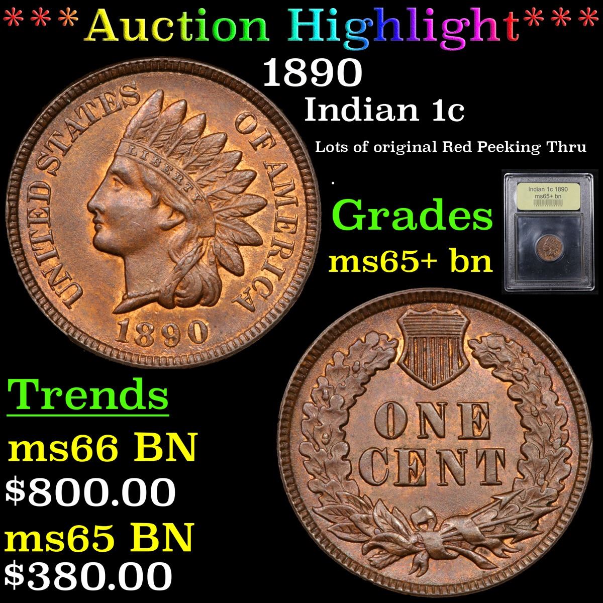 ***Auction Highlight*** 1890 Indian Cent 1c Graded GEM+ Unc BN By USCG. A Corey's Pick, Bid to Win Coin