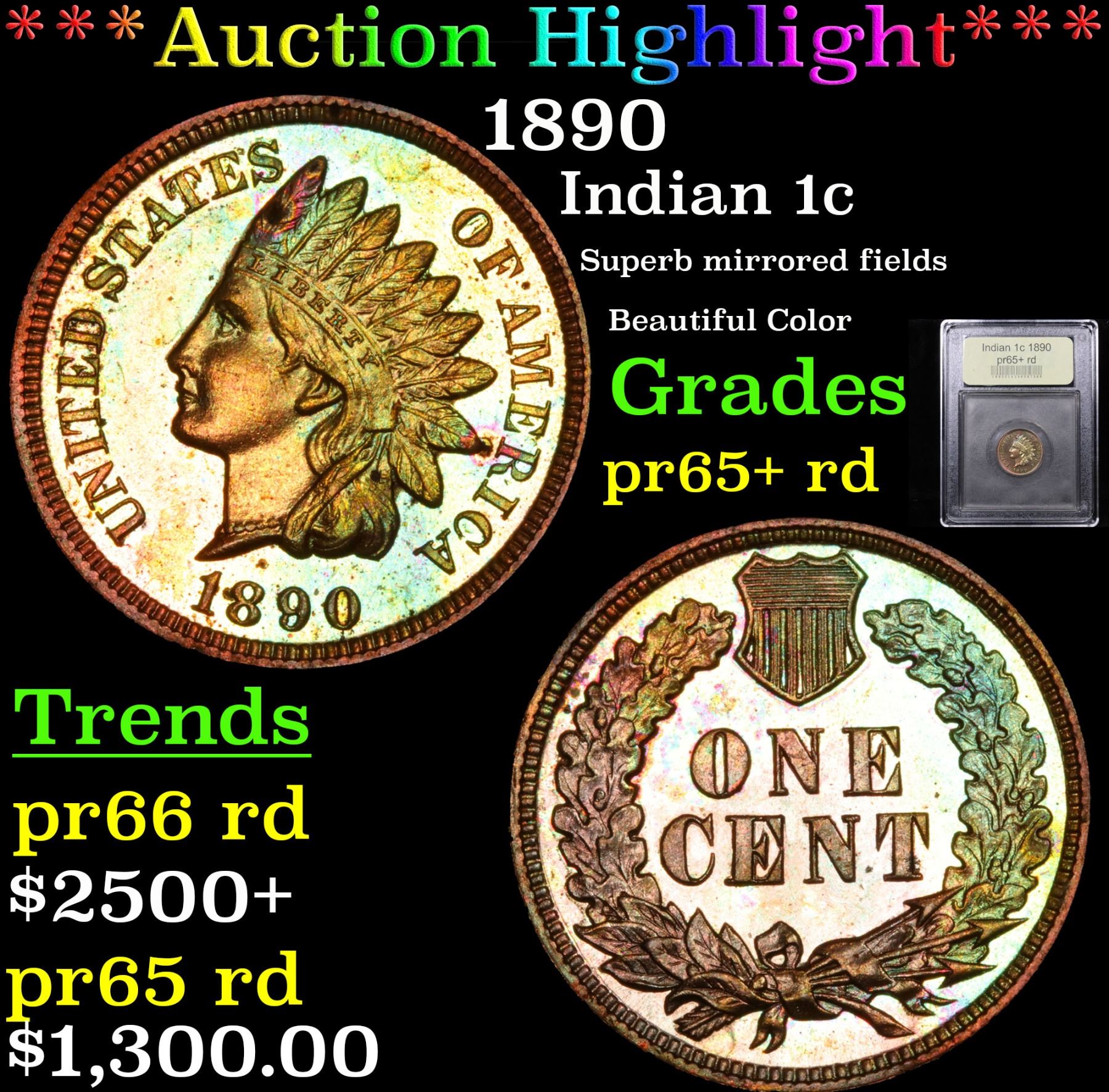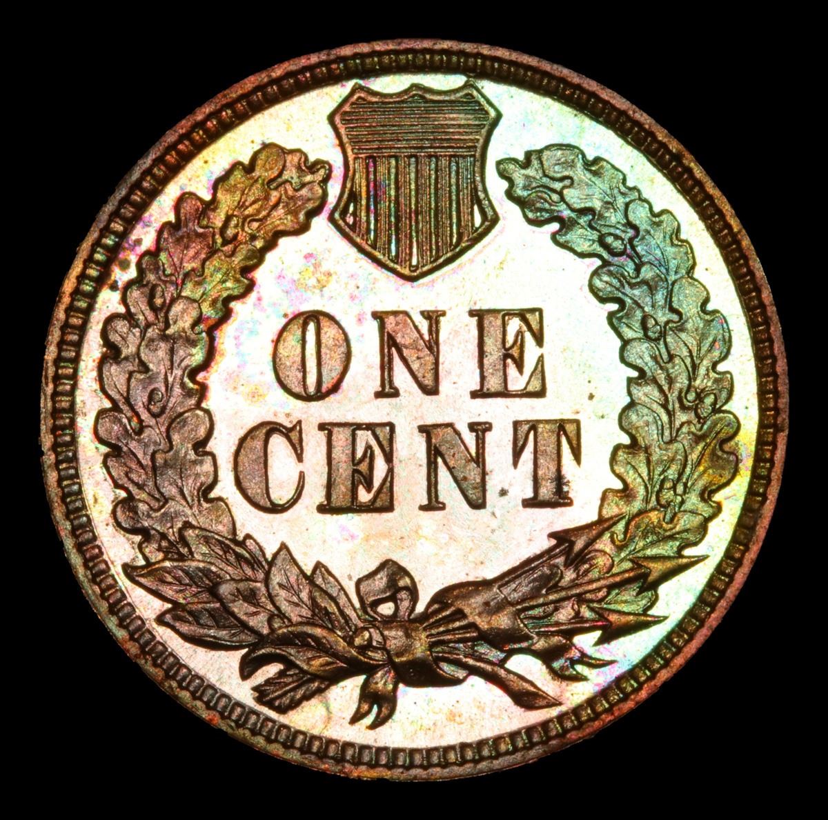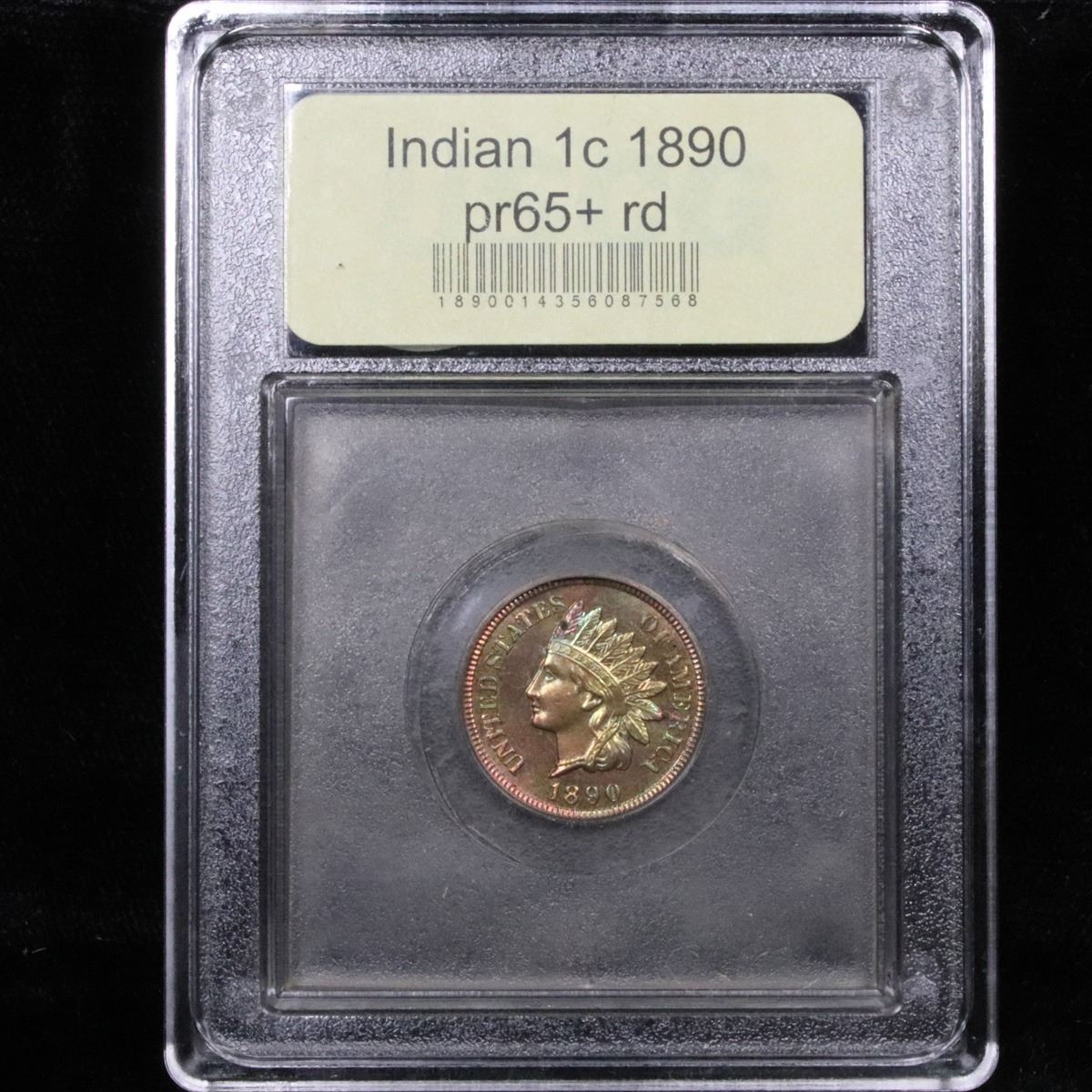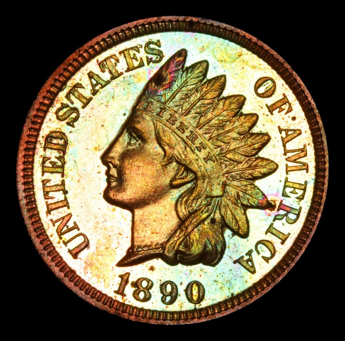 ***Auction Highlight*** 1890 Superb mirrored fields Beautiful Color Indian Cent 1c Graded Gem++ Proof Red By USCG. Superb mirrored fields, beautiful color, great blue highlights to the toning, spectacular eye appeal. A dynamite Indian Proof! Near Top Pop