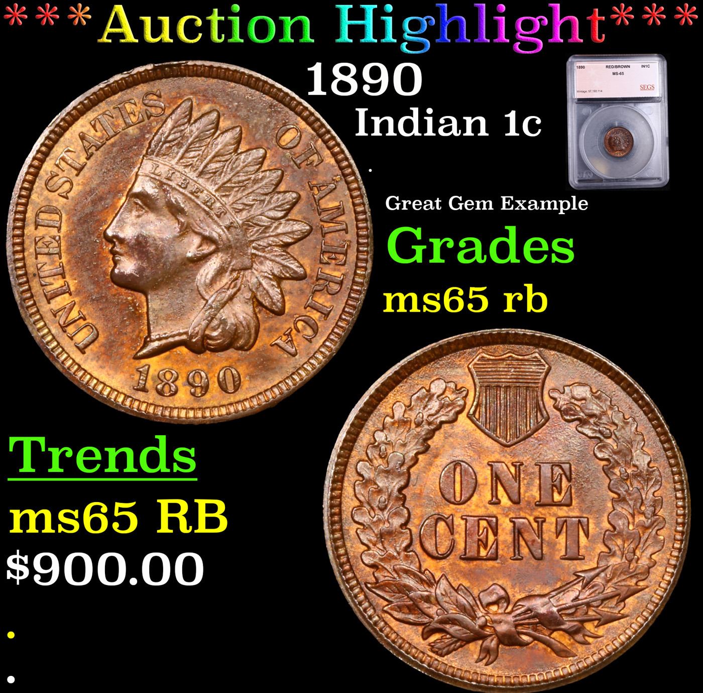 ***Auction Highlight*** 1890 Indian Cent 1c Graded ms65 rb BY SEGS. A Key Date's Pick, Bid to Win Coin
