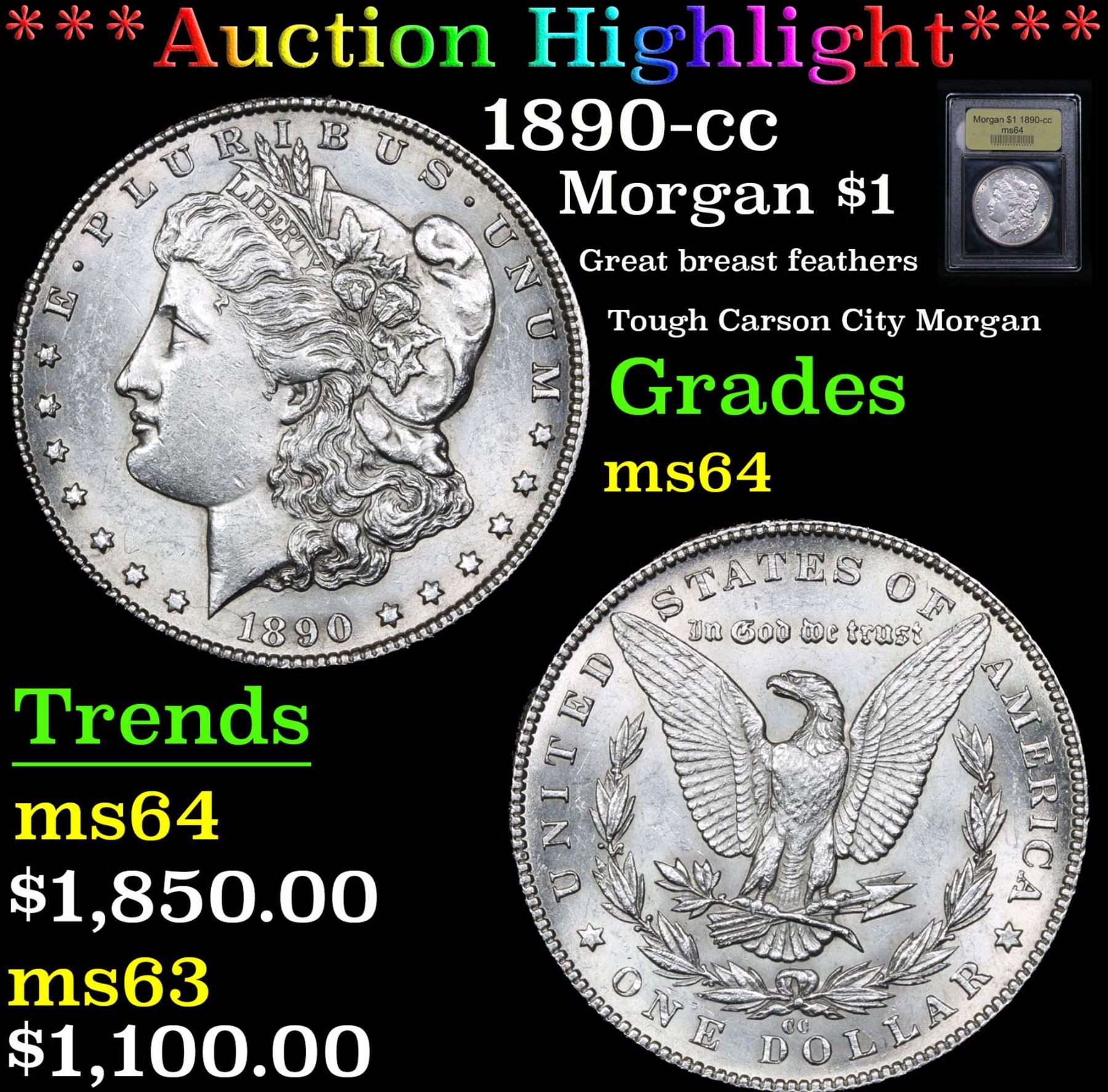 ***Auction Highlight*** 1890-cc Morgan Dollar $1 Graded Choice Unc By USCG. Great breast feathers; Tough Carson City Morgan