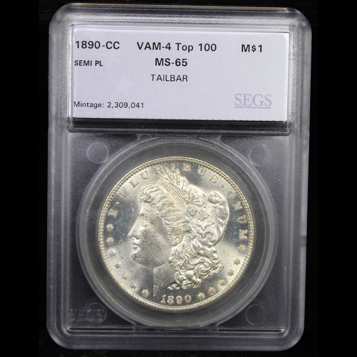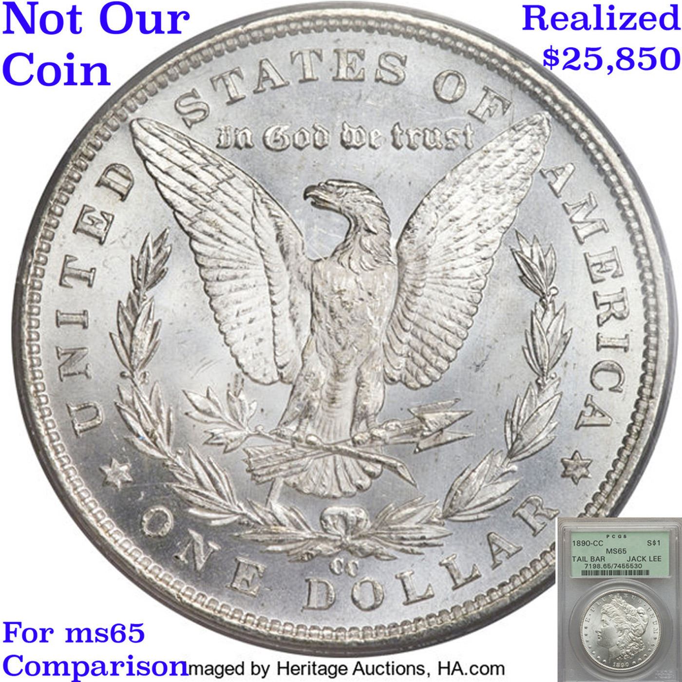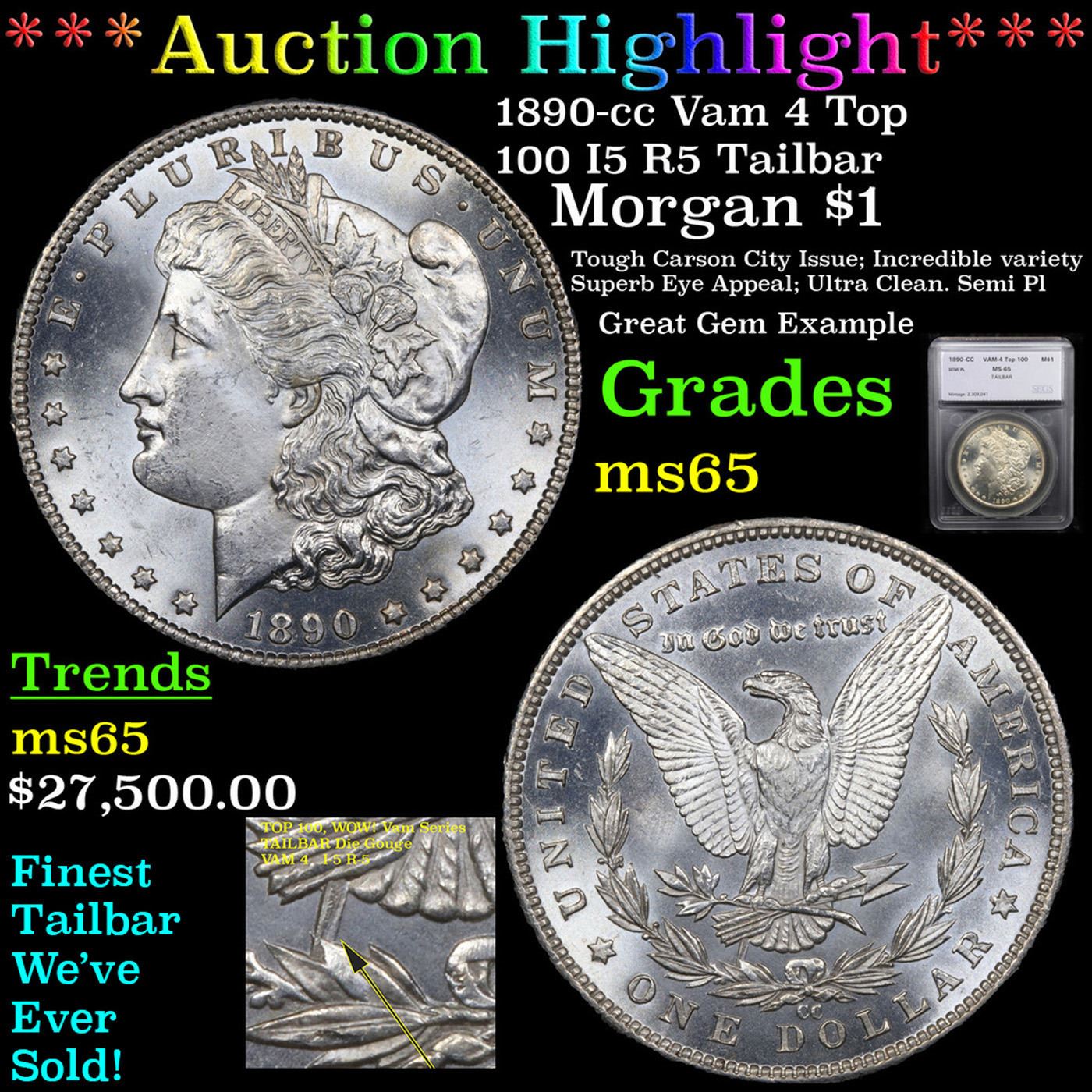 ***Auction Highlight*** 1890-cc Vam 4 Top 100 I5 R5 Tailbar Morgan Dollar $1 Graded ms65 By SEGS. This GEM has a lot going for it. First it is among the five FINEST graded examples of this very popular Morgan Dollar variety; only a single MS65+ is certified finer. The luster displays lively swirling cartwheels over a semi-PL texture on the reverse. Blast white, there is nothing to disturb the wonderful eye appeal. While there are many Morgan dollar varieties, many of them are very minor and esoteric, needing a strong glass to identify, the Tail Bar is visible by the naked eye and is often included in advanced sets of Morgan's. We have included two other ms65 Examples for your comparison, included the last to sell, the ex. Jack Lee Example that realized $25,850 in June of 2017. Clearly this is a special coin for the advanced CC collector, and we anticipate strong bidding. A Corey's Pick, Bid to Win, Don't let it get Away, you might not find its equal Coin. I give this coin my highest recommendation