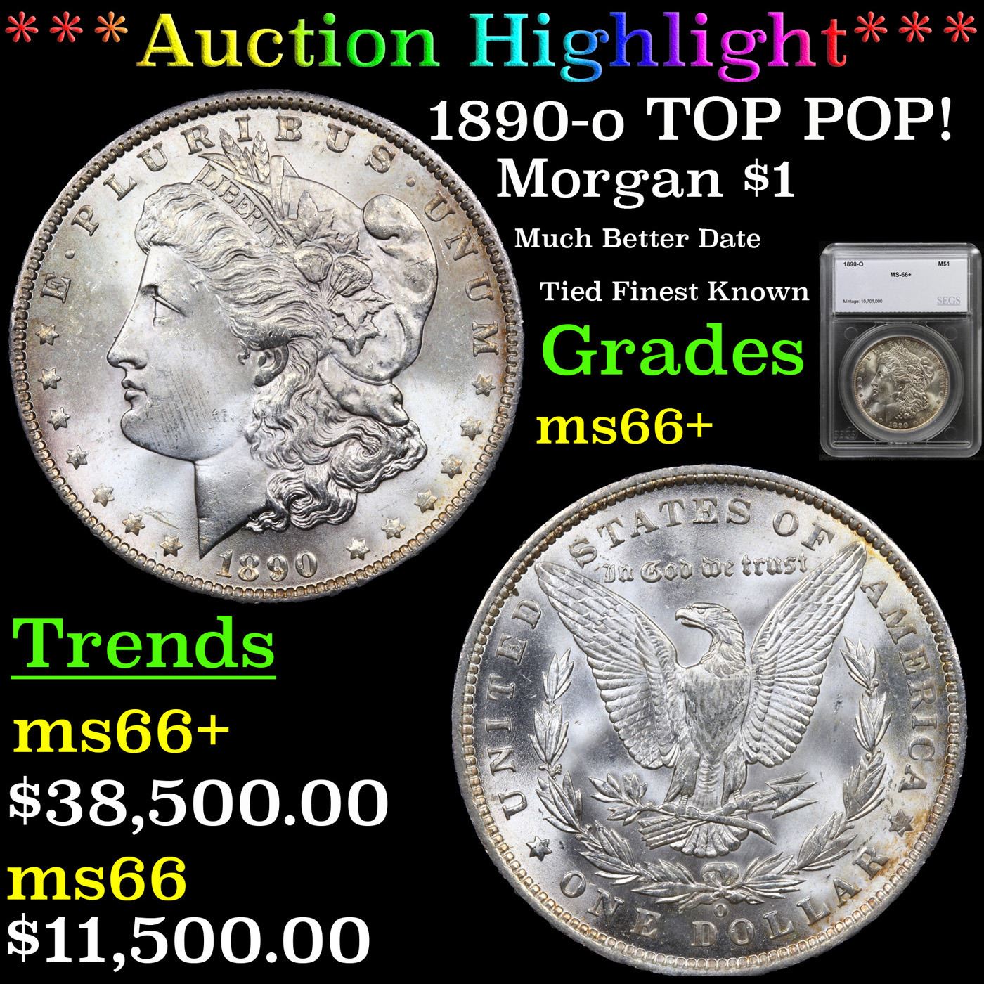 ***Auction Highlight*** 1890-o TOP POP! Morgan Dollar $1 Graded ms66+ By SEGS. A Corey's Pick, Bid to Win, Don't let it get Away, you might not find its equal Coin. I give this coin my highest recommendation