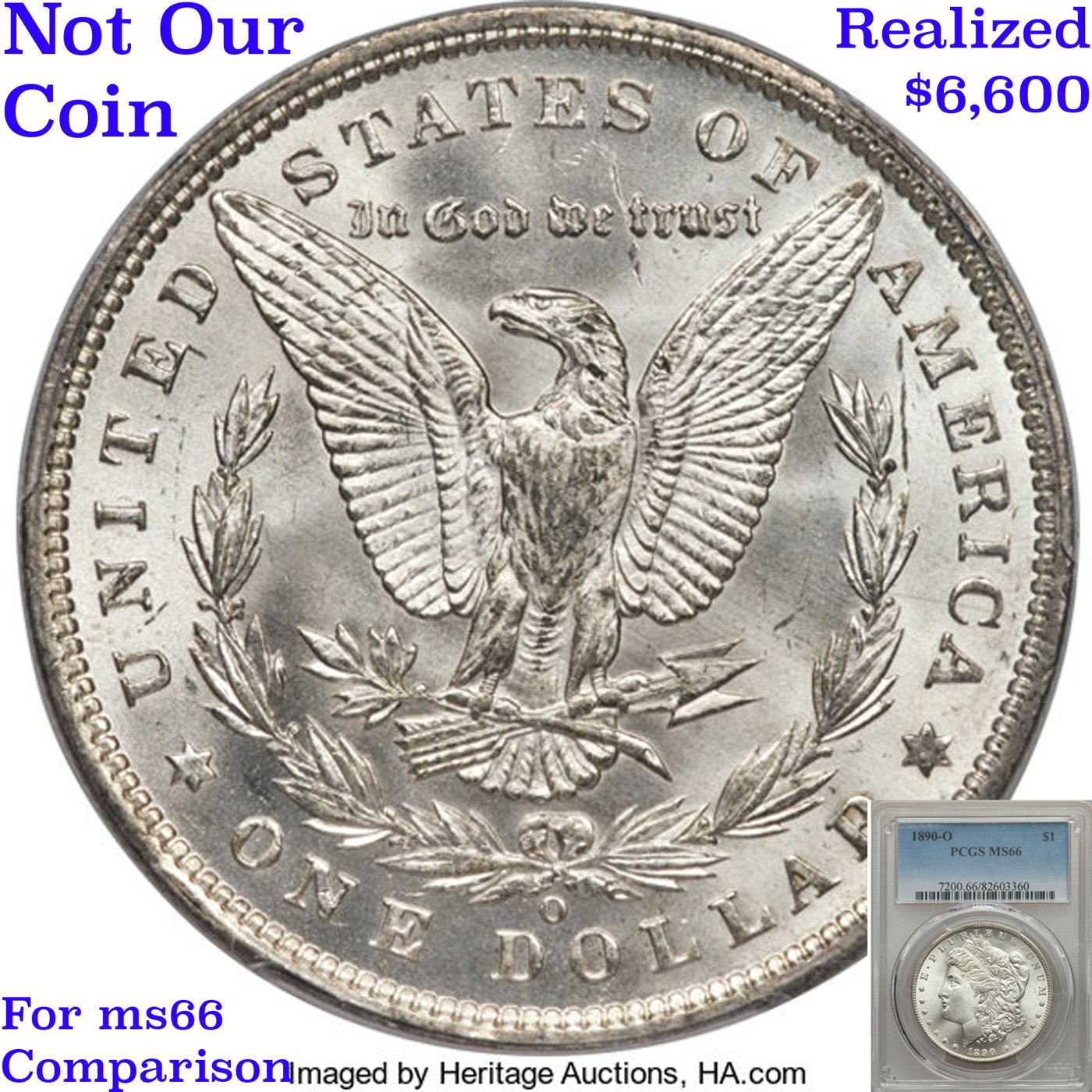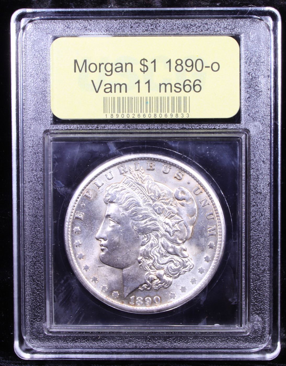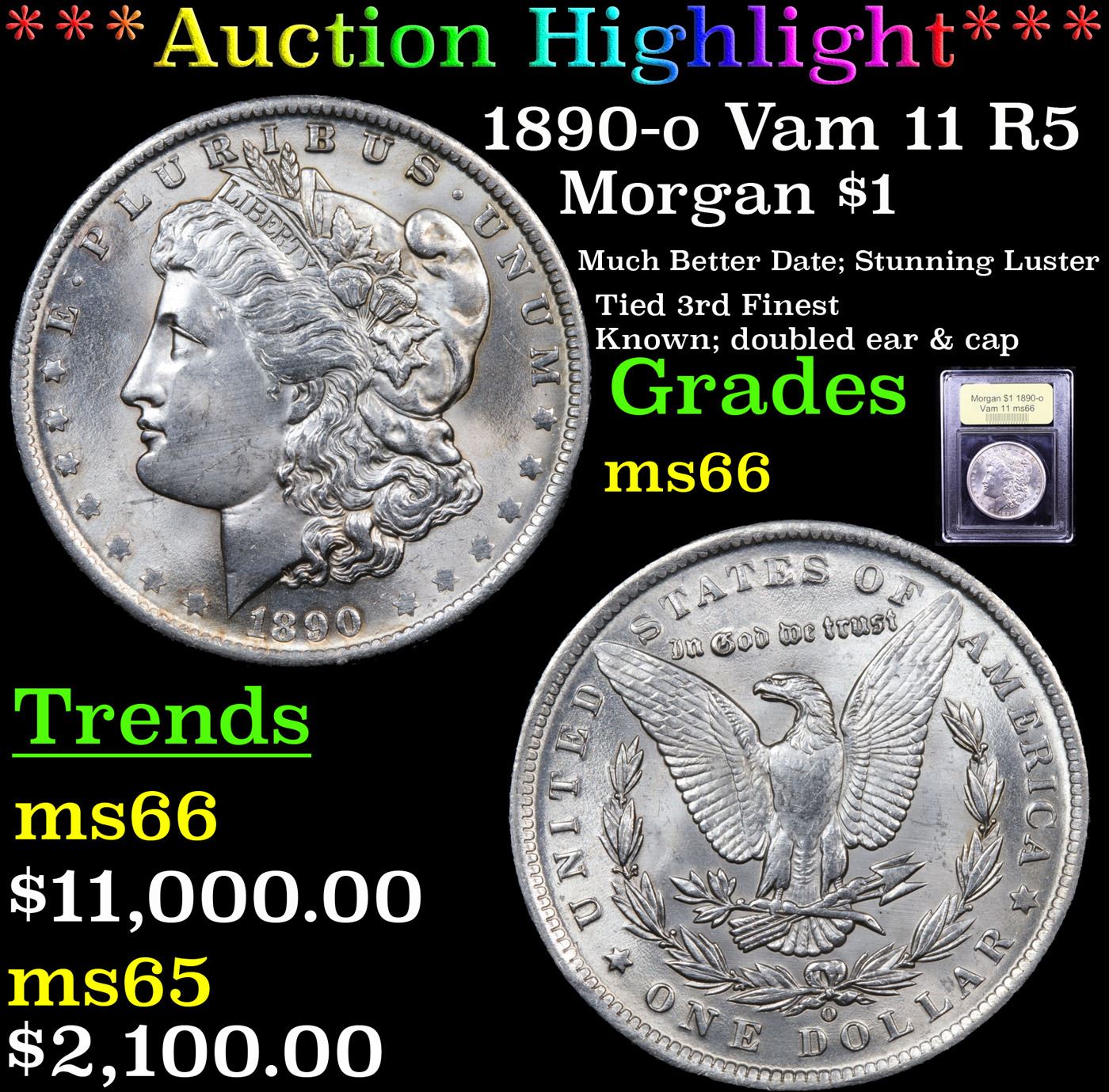***Auction Highlight*** 1890-o Vam 11 R5 Morgan Dollar $1 Graded GEM+ Unc By USCG. The availability of the 1890-O Morgan dollar drops off sharply in MS66, and no finer coins are known. The coin is brilliant and well-struck for the date, showing exceptionally clean surfaces. The luster is the showstopper here though, shimmering like frost when rotated beneath a light. Although some 1890-O dollars are well-produced, the issue is notorious for weak strikes and heavy bag marks. This Gem plus example is notably free of such marks, and the strike is only slightly weak over the centers. The coin has faint mint roller marks on both sides visible only under magnification. I am including two examples for your comparison. Both are other ms66 examples, one clearly shows the same mint made roller marks on a 66 graded coin. A Corey's Pick, Bid to Win, Don't let it get Away, you might not find its equal Coin. I give this coin my highest recommendation
