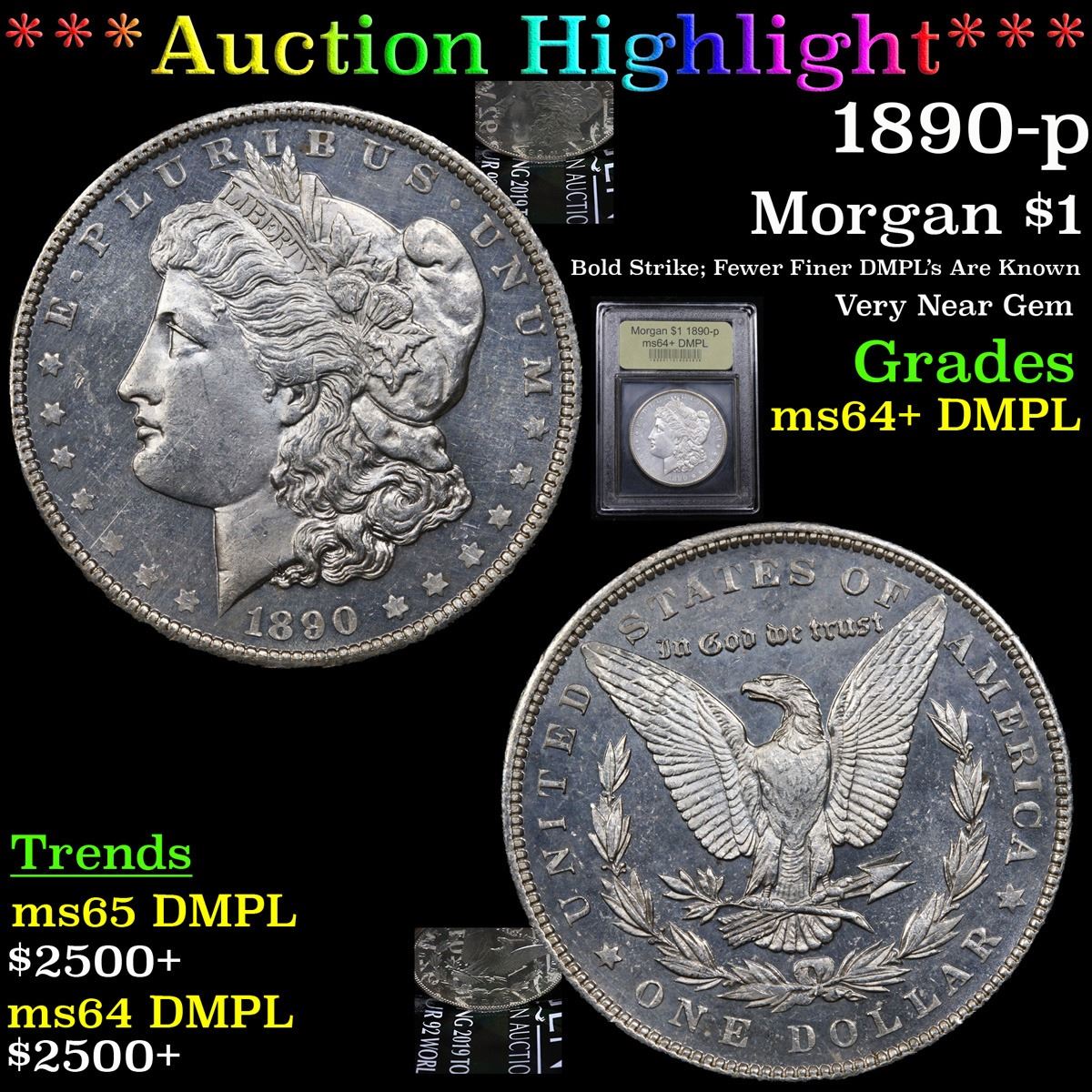 ***Auction Highlight*** 1890-p Morgan Dollar $1 Graded Choice Unc+ DMPL By USCG. A bold strike complements frosty mint luster on the devices of this Plus-graded piece, with starkly contrasted mirrors in the fields. There are a few light marks in the left obverse field that limit the grade, but they are not overly bothersome. Neither side exhibits measurable toning. Few finer Deep Mirror Proof like pieces are known A Corey's Pick, Bid to Win, Don't let it get Away, you might not find its equal Coin. I give this coin my highest recommendation