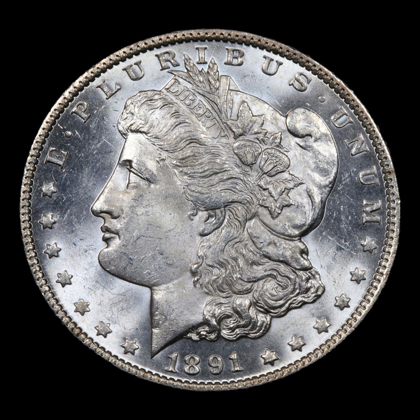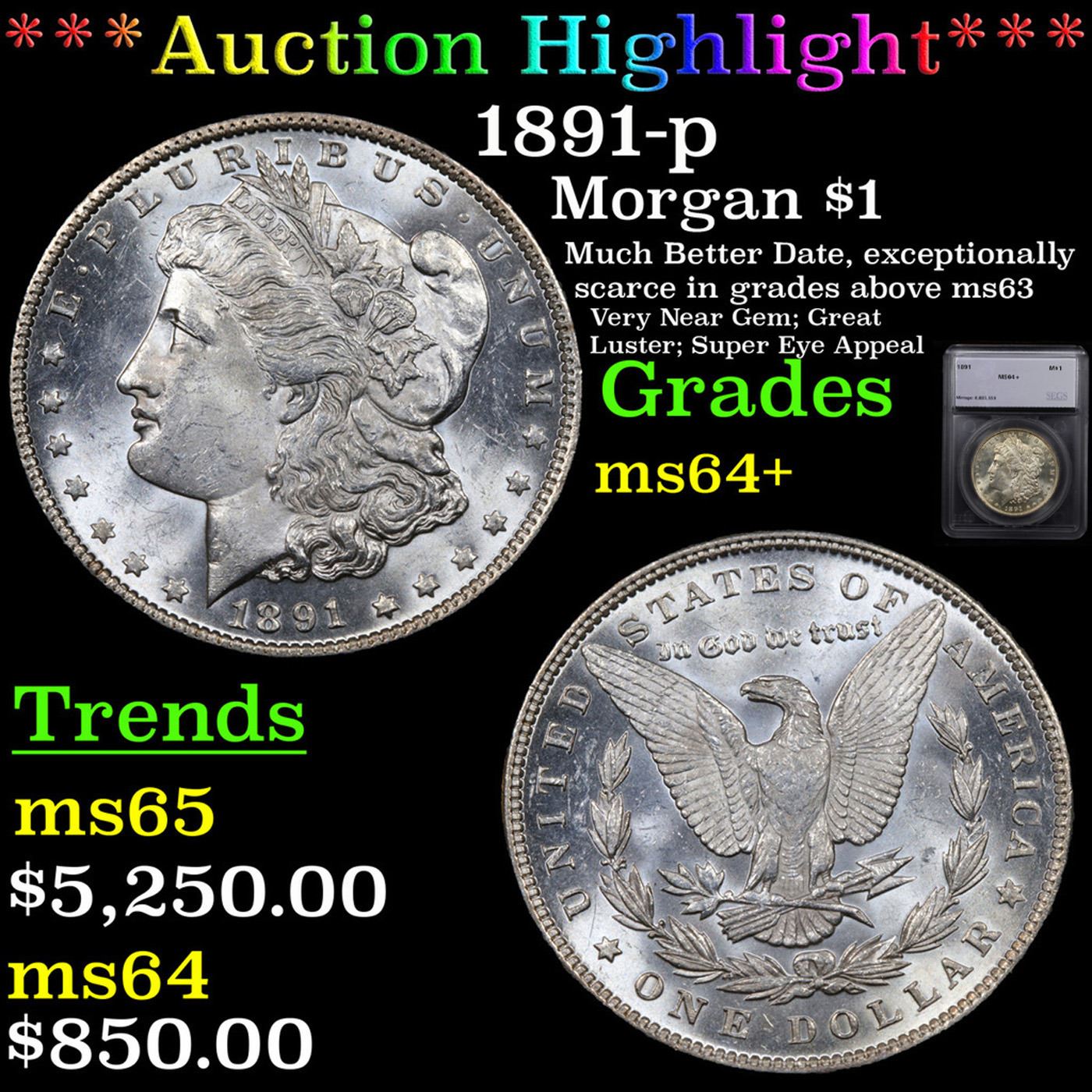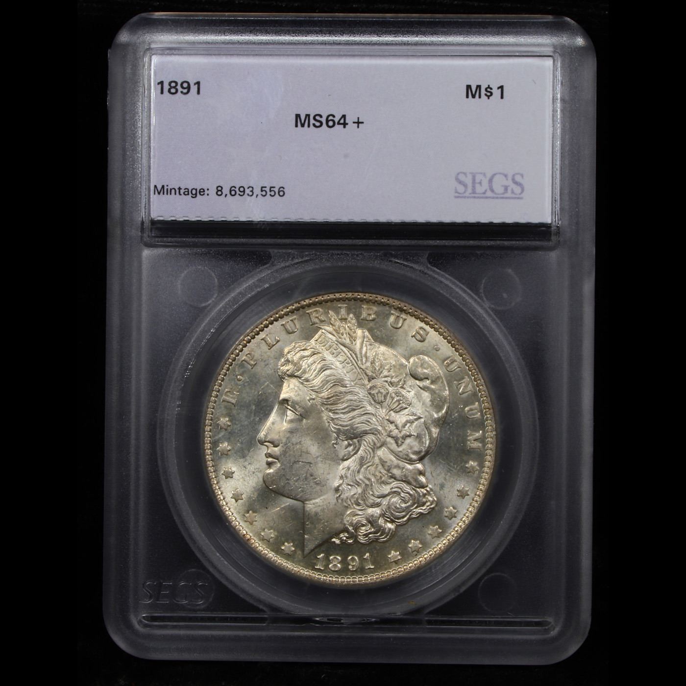 ***Auction Highlight*** 1891-p Morgan Dollar $1 Graded ms64+ By SEGS. The 1891-p is exceptionally scarce in grades above ms63. This near gem example has great luster and sharp devices. Super eye appeal. A great addition to a high end Morgan collection. A Corey's Pick, Bid to Win, Don't let it get Away Coin
