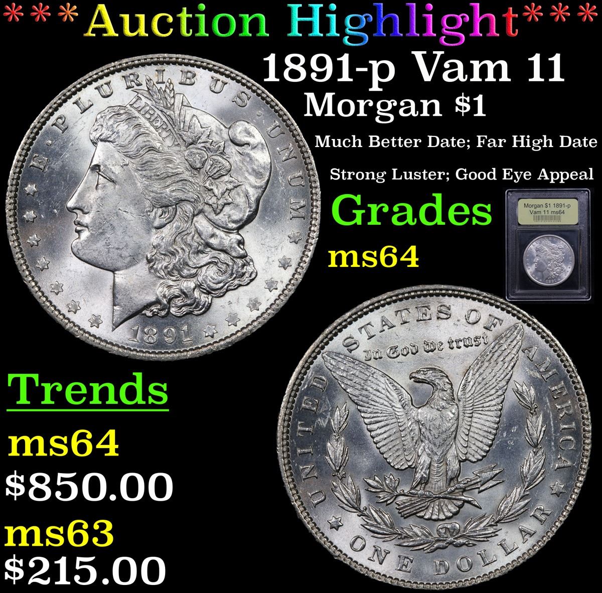 ***Auction Highlight*** 1891-p Vam 11 Morgan Dollar $1 Graded Choice Unc By USCG. A Corey's Pick, Bid to Win Coin