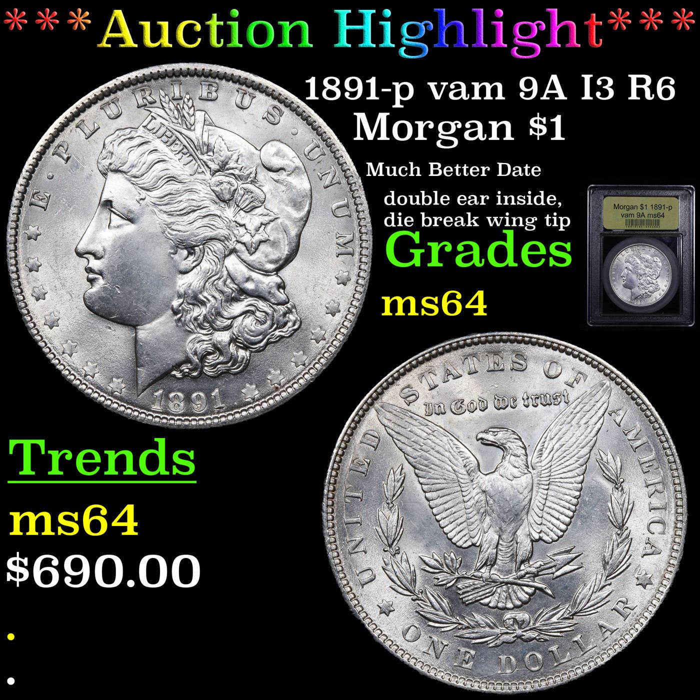 ***Auction Highlight*** 1891-p vam 9A I3 R6 Morgan Dollar $1 Graded Choice Unc By USCG.