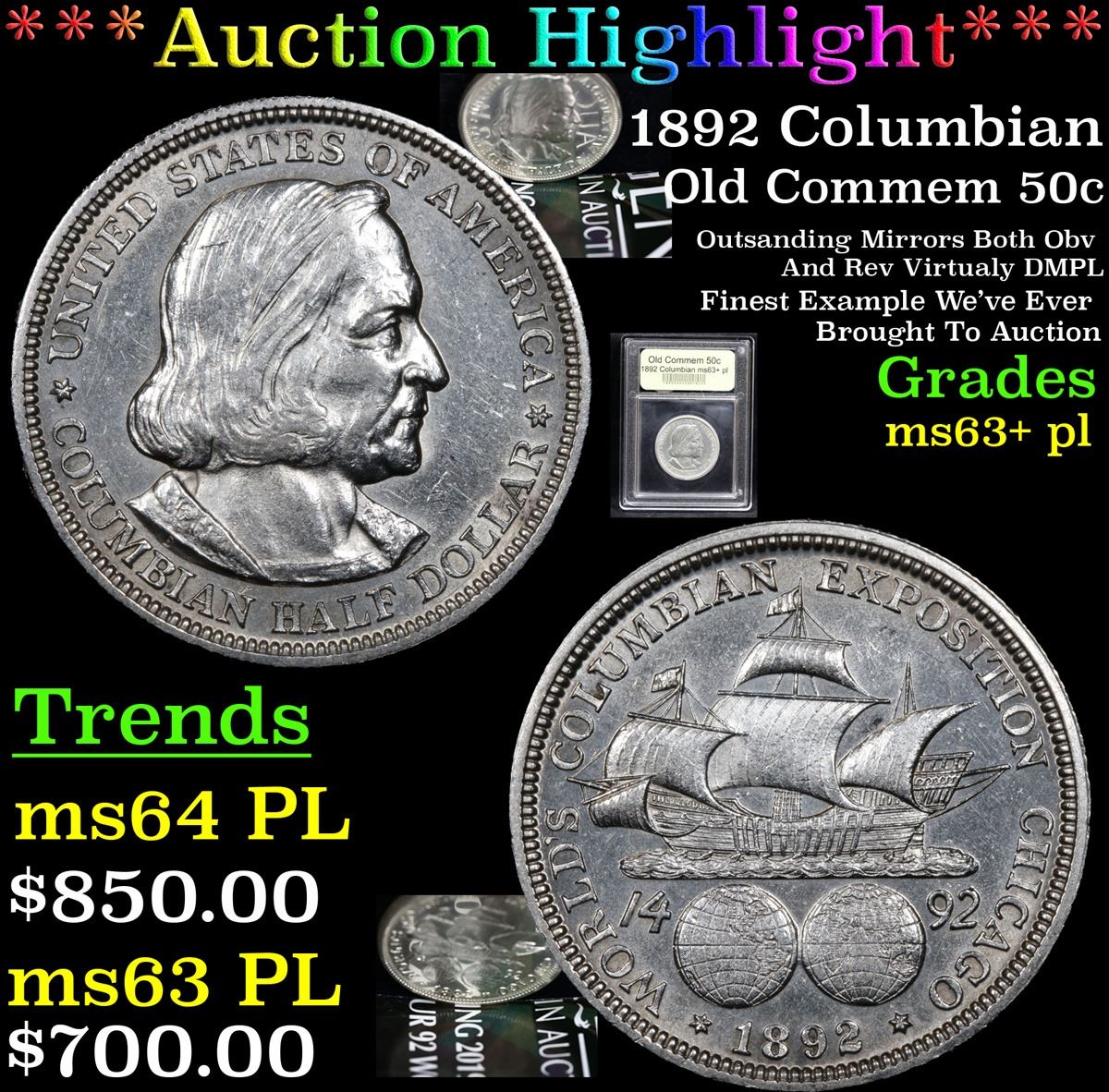 ***Auction Highlight*** 1892 Columbian Outsanding Mirrors Both Obv And Rev Virtualy DMPL Finest Example We've Ever Brought To Auction Old Commem Half Dollar 50c Graded Select Unc+ PL By USCG. The Columbus Half Dollar along with the Isabella Quarter were Minted in Honor of the 400th Anniversary of Columbus' Voyage to the New World. It was First Distributed at the Worlds Fair Honoring that Voyage. When Examining a Columbian Exposition Half Dollar, the First Points to Show Wear are Columbus’ Eyebrow, Cheek and the Hair Behind his Forehead and Jaw. On the Reverse, Check the Foresail and Sainsail, as well as the Right Side of the Eastern Hemisphere. A Corey's Pick, Bid to Win, Don't let it get Away, you might not find its equal Coin