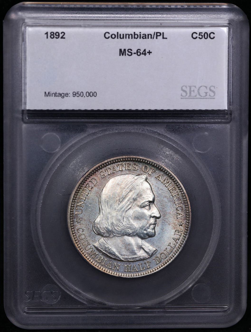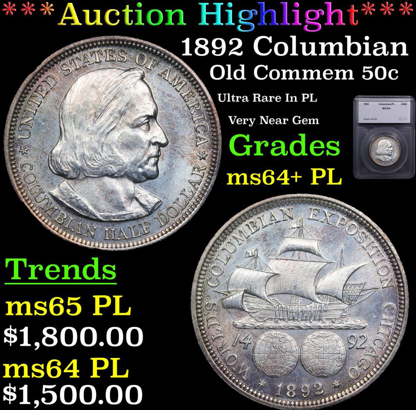 ***Auction Highlight*** 1892 Columbian Old Commem Half Dollar 50c Graded ms64+ PL BY SEGS. The Columbus Half Dollar along with the Isabella Quarter were Minted in Honor of the 400th Anniversary of Columbus' Voyage to the New World. It was First Distributed at the Worlds Fair Honoring that Voyage. When Examining a Columbian Exposition Half Dollar, the First Points to Show Wear are Columbus’ Eyebrow, Cheek and the Hair Behind his Forehead and Jaw. On the Reverse, Check the Foresail and Sainsail, as well as the Right Side of the Eastern Hemisphere.