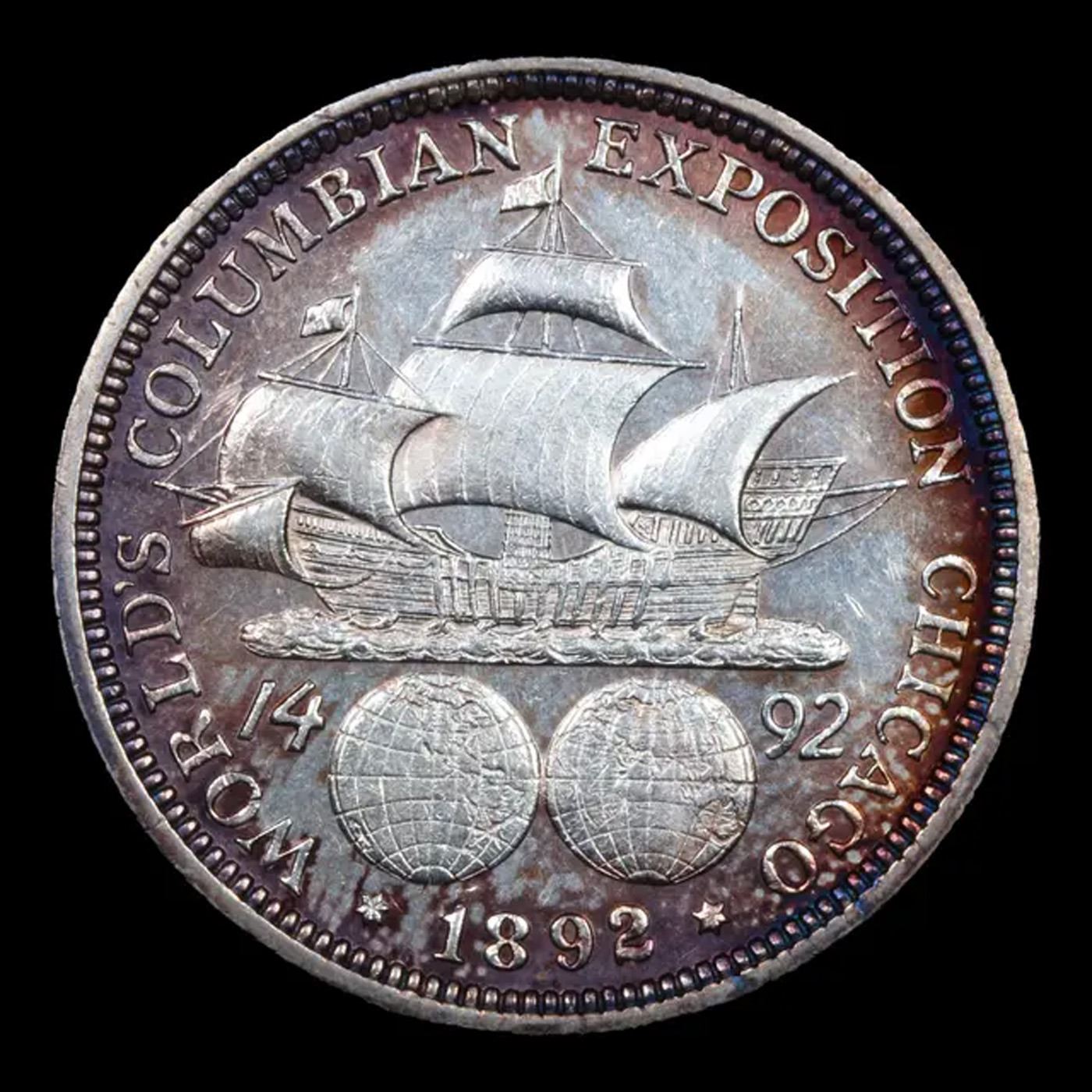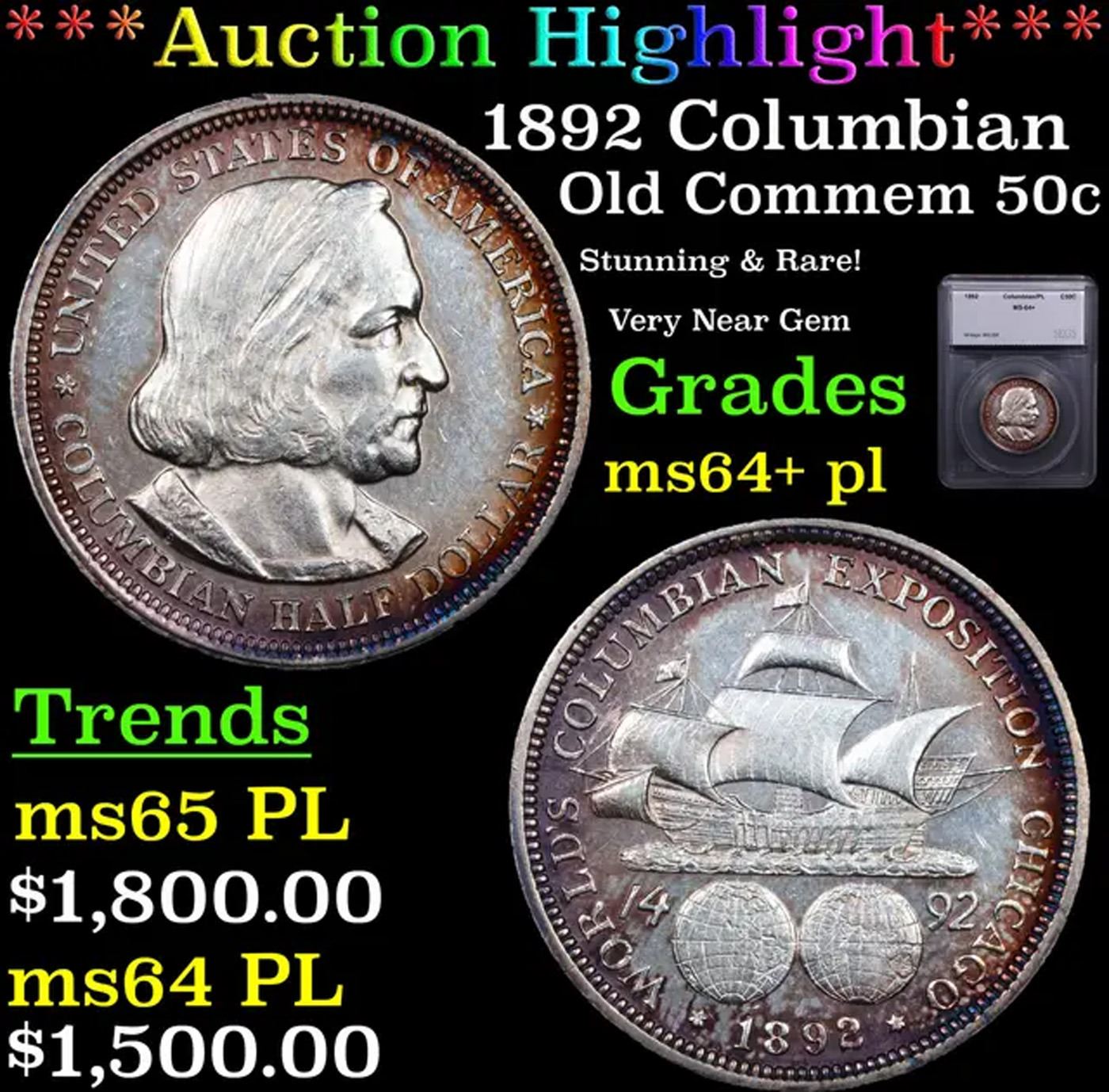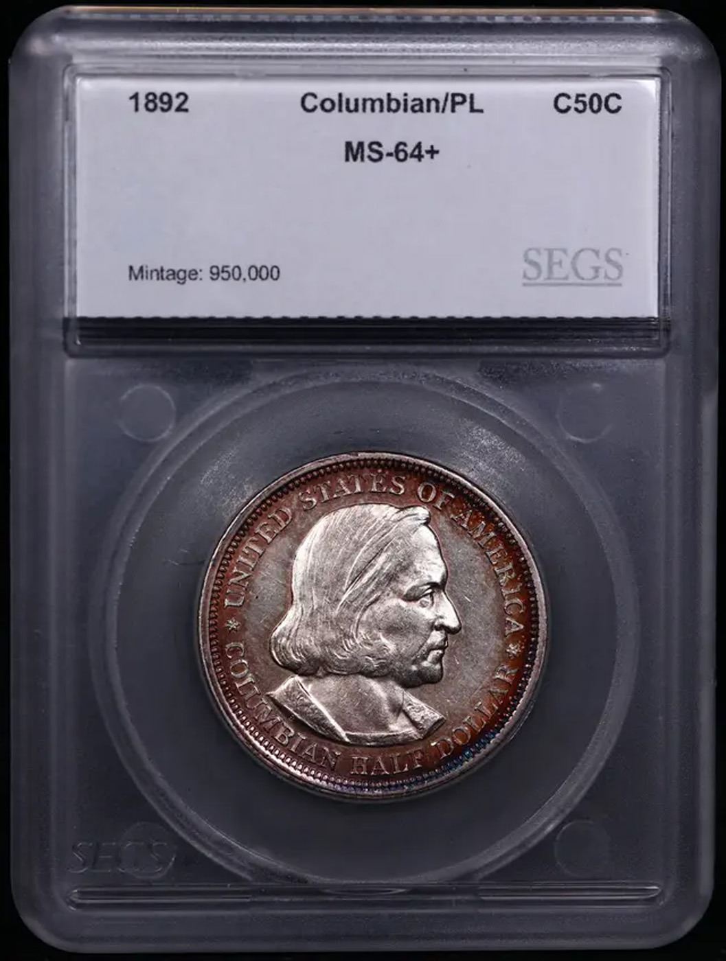 ***Auction Highlight*** 1892 Columbian Old Commem Half Dollar 50c Graded ms64+ pl By SEGS. The Columbus Half Dollar along with the Isabella Quarter were Minted in Honor of the 400th Anniversary of Columbus' Voyage to the New World. It was First Distributed at the Worlds Fair Honoring that Voyage. When Examining a Columbian Exposition Half Dollar, the First Points to Show Wear are Columbus’ Eyebrow, Cheek and the Hair Behind his Forehead and Jaw. On the Reverse, Check the Foresail and Sainsail, as well as the Right Side of the Eastern Hemisphere. A Key Date's Pick, Bid to Win, Don't let it get Away, you might not find its equal Coin