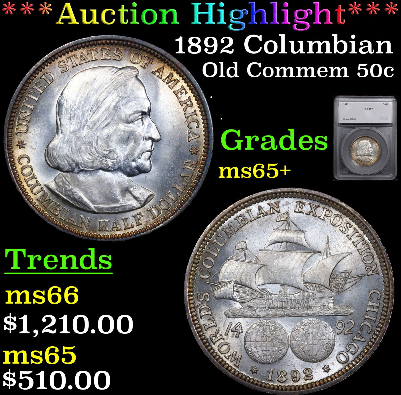 ***Auction Highlight*** 1892 Columbian Old Commem Half Dollar 50c Graded ms65+ By SEGS. The Columbus Half Dollar along with the Isabella Quarter were Minted in Honor of the 400th Anniversary of Columbus' Voyage to the New World. It was First Distributed at the Worlds Fair Honoring that Voyage. When Examining a Columbian Exposition Half Dollar, the First Points to Show Wear are Columbus’ Eyebrow, Cheek and the Hair Behind his Forehead and Jaw. On the Reverse, Check the Foresail and Sainsail, as well as the Right Side of the Eastern Hemisphere.
