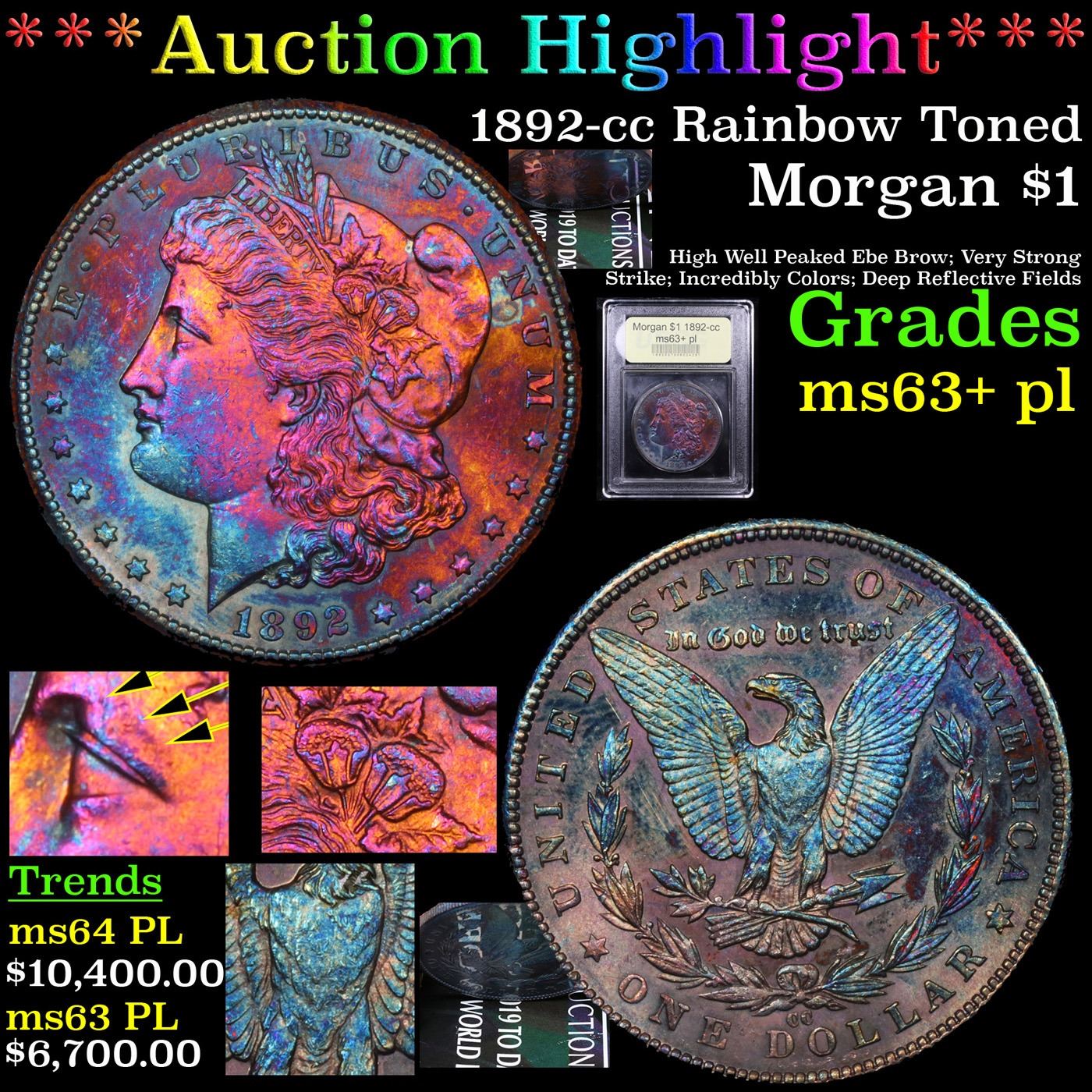***Auction Highlight*** 1892-cc Rainbow Toned Morgan Dollar $1 Graded Select Unc+ PL By USCG. Up for Auction is a Wild 1892-cc in roof Like, with Rainbow Toning. Superb Strike with High almost High Relief Breast Feathers. Mirror Like Fields and blazing Luster. Outstanding Eye Appeal with Blues and Oranges and some seafoam green on the Obverse. The Reverse is mainly Seafoam Green and Blue with some Purple. A rare Date, even rarer in PL and even more so rainbow toned. A Corey's Pick, Bid to Win, Don't let it get Away, you might not find its equal Coin. I give this coin my highest recommendation