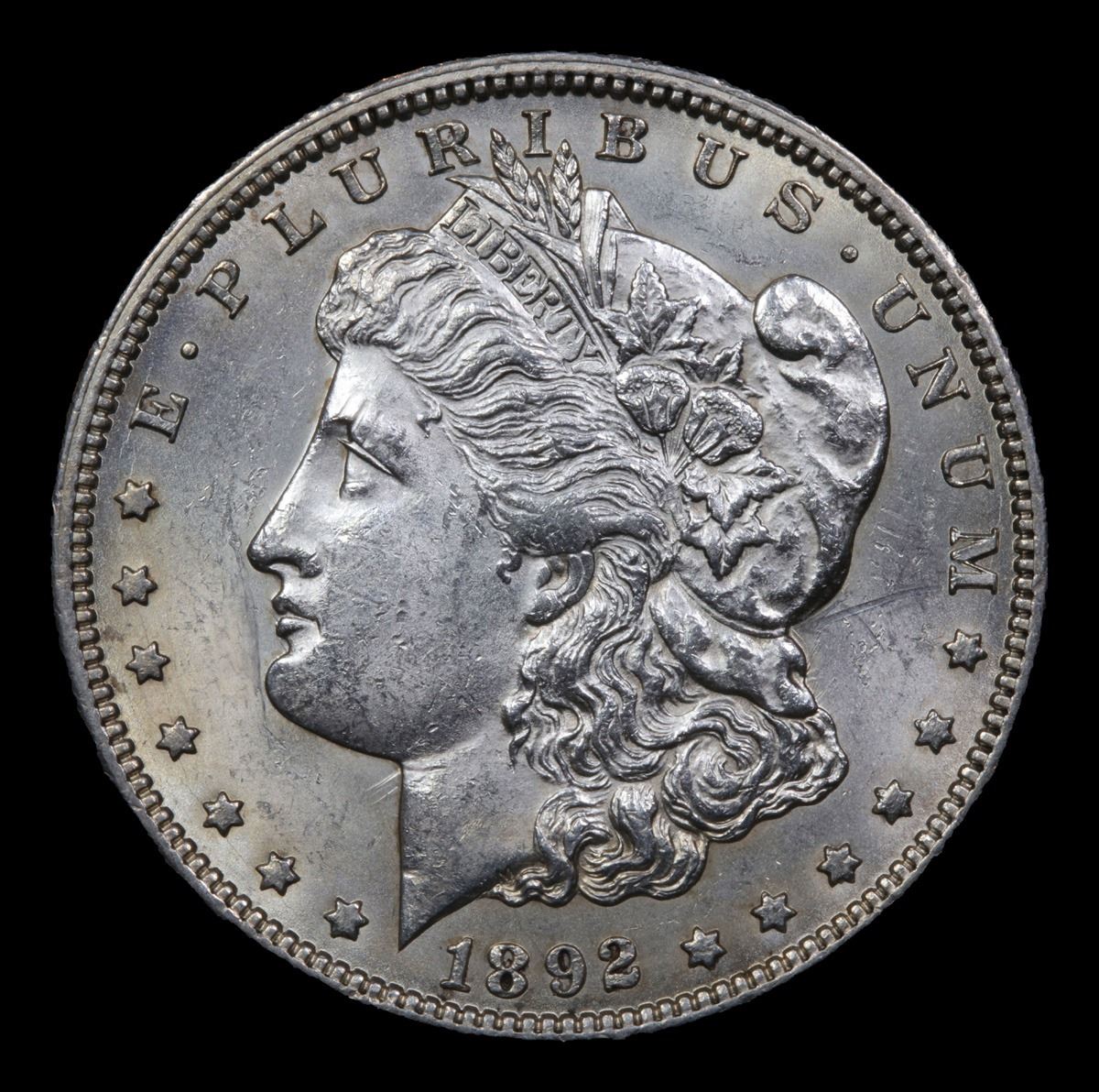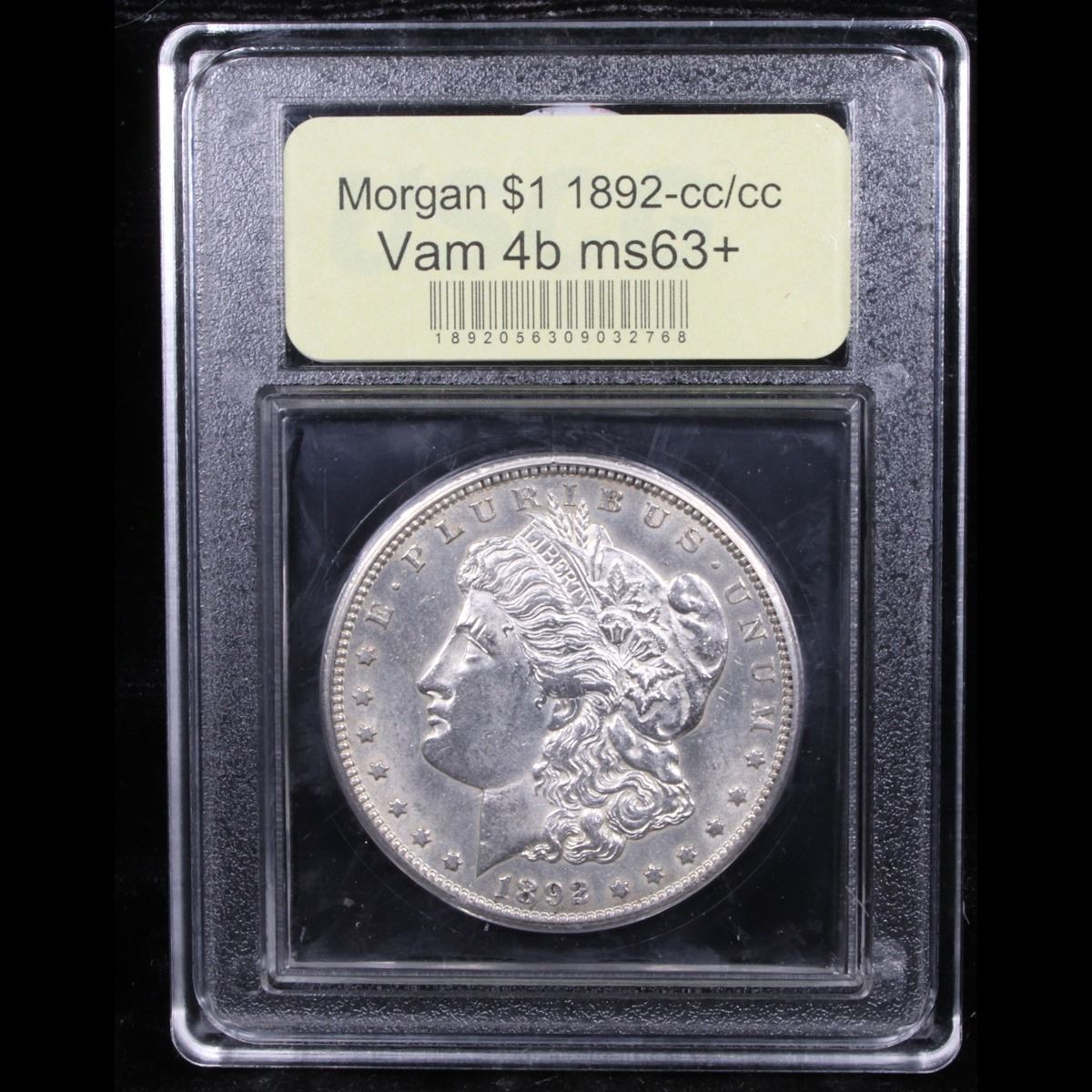 ***Auction Highlight*** 1892-cc /cc Vam 4b R5 Morgan Dollar $1 Graded Select+ Unc BY uSCG. Brilliant frosty-white surfaces are host to a bold to sharp strike throughout. Incredibly strong breast feathers. Here is a Choice Mint State example of a scarcer Carson City Mint Morgan dollar issue. It is the scarce cc/cc Vam 4B, Rarity 5 variety. A Corey's Pick, Bid to Win, Don't let it get Away, you might not find its equal Coin