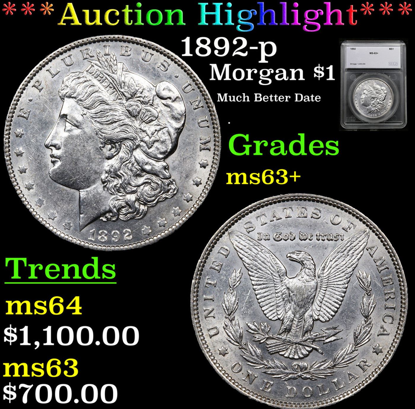 ***Auction Highlight*** 1892-p Morgan Dollar 1 Graded ms63+ By SEGS.