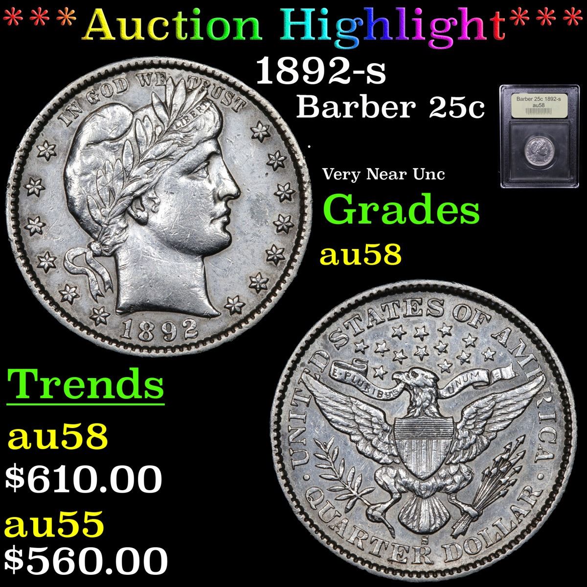 ***Auction Highlight*** 1892-s . Very Near Unc Barber Quarter 25c Graded Choice AU/BU Slider By USCG.